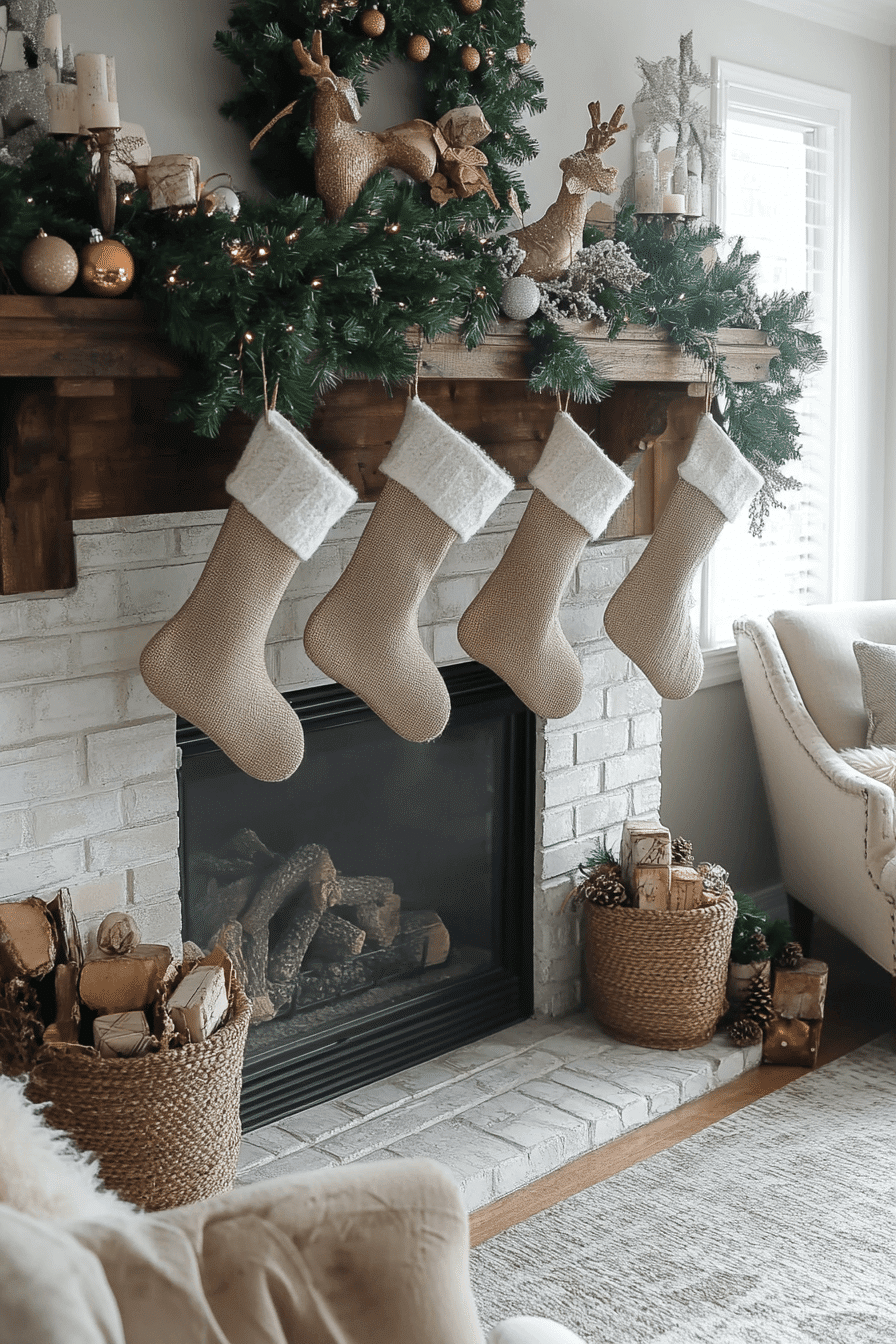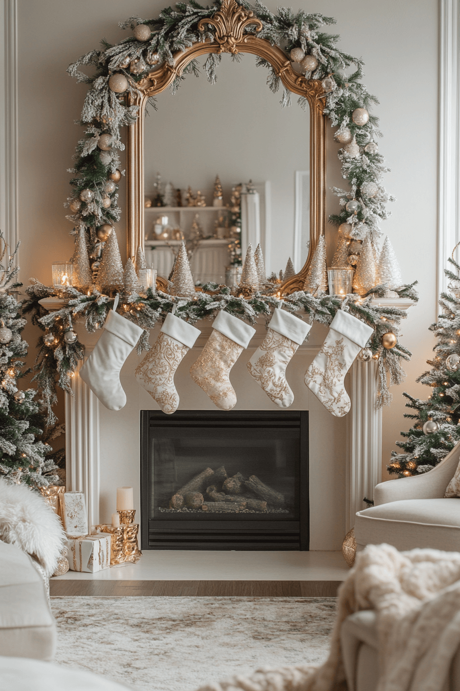 Kick off a sophisticated holiday upgrade with christmas mantel decor highlighting luxurious golds, silvers, and gentle champagne tones. Velvet stockings and shimmering crystals create depth while maintaining refined warmth. Soft lights mingle with greenery to balance glamour and comfort seamlessly. This polished style is ideal for elegant gatherings or peaceful festive evenings.