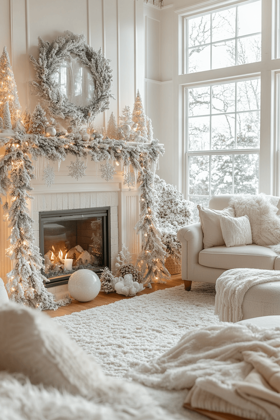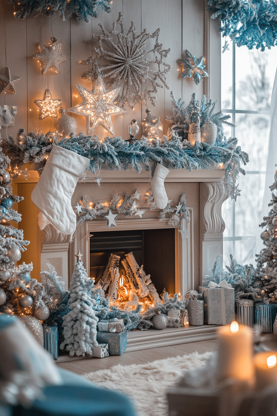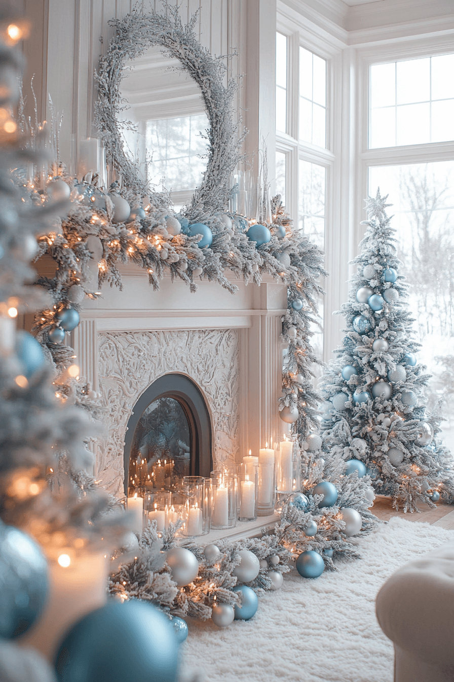 Start transforming your fireplace with christmas mantel decor inspired by snowy landscapes full of icy blues, crisp whites, and twinkling silvers. Snow-tipped garlands and shimmering accents create a magical frost-kissed glow across the room. Soft lighting enhances each delicate winter detail without overwhelming the peaceful palette. The entire scene captures the dreamy quiet of a snowfall indoors.
