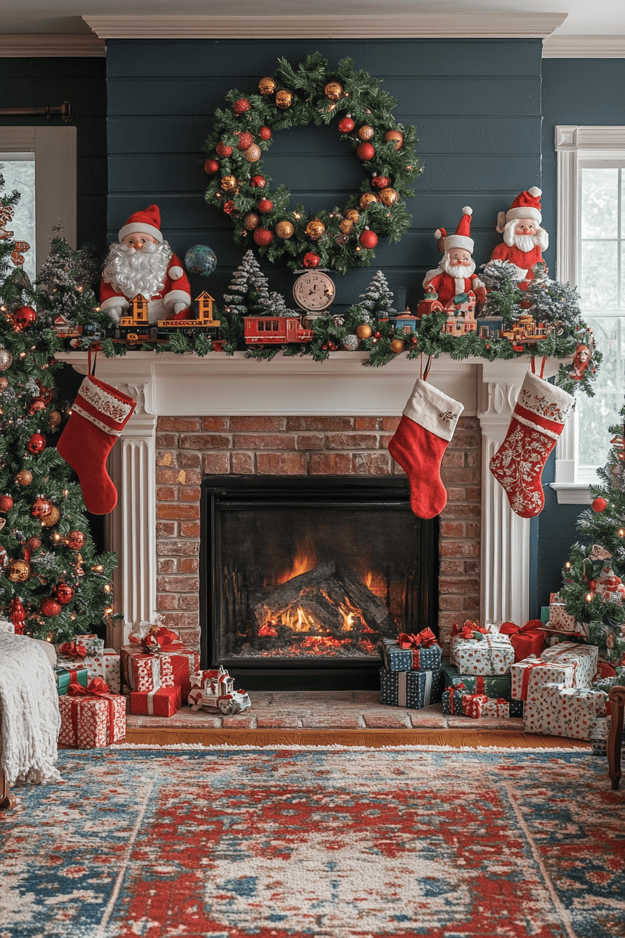 Invite cheerful holiday fun with christmas mantel decor inspired by Santa’s Workshop bursting with bright colors and playful details. Cute figurines, candy-striped accents, and festive garlands bring joyful energy into the room. Every piece adds personality without overwhelming the space. The setup feels lively, nostalgic, and full of imagination.