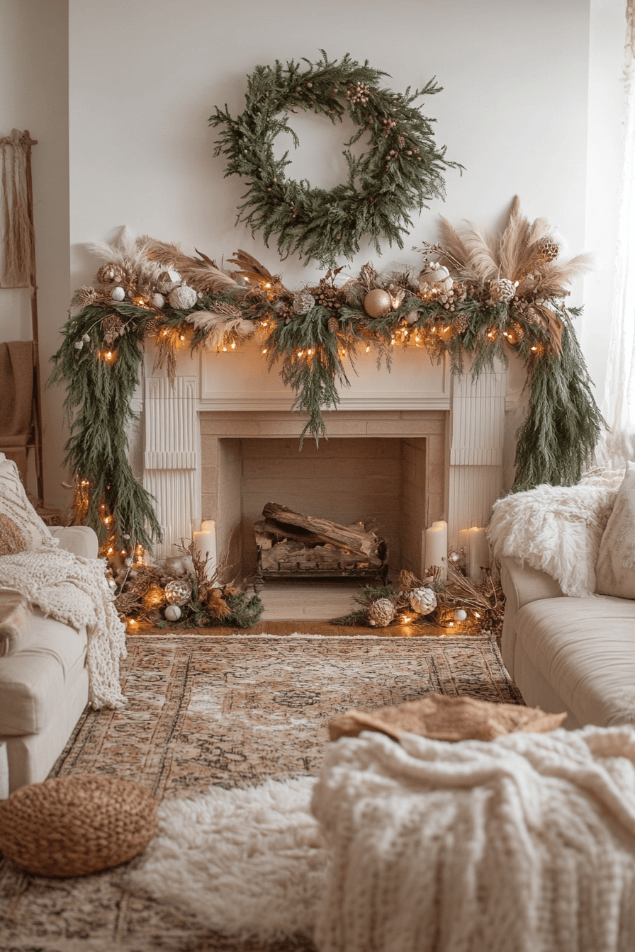 Enhance your home with relaxed artistic charm using christmas mantel decor featuring macramé, wood beads, and global patterns. Layered textures create a cozy, free-spirited atmosphere. Natural elements ensure the scene remains warm and grounded. Each detail adds a touch of creativity without losing comfort.