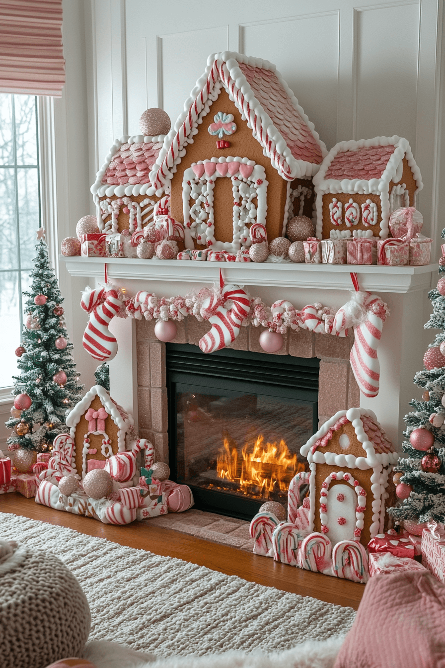 Celebrate festive sweetness with christmas mantel decor inspired by gingerbread cottages and colorful candy stripes. Charming details like mini gingerbread houses and peppermint accents bring cheerful whimsy. Soft lighting helps the playful colors stand out beautifully. The look is warm, bright, and joyfully nostalgic.