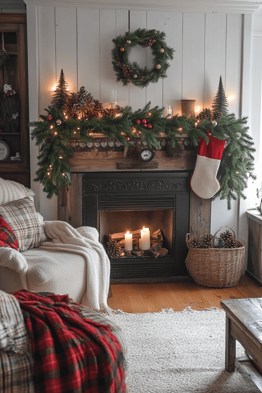 Surround your fireplace with timeless coziness using christmas mantel decor made with classic plaid, rustic woods, and fresh pine. Natural greenery adds fullness and traditional charm. Textured accents bring warmth that anchors the whole scene. Plaid ribbons and pinecones enhance the inviting cabin-like feel.