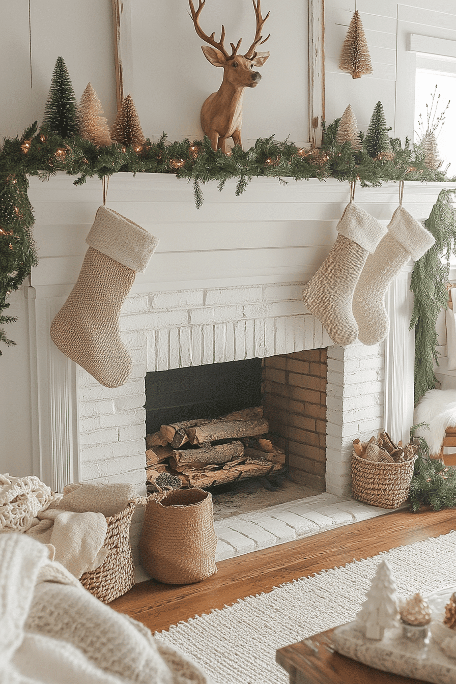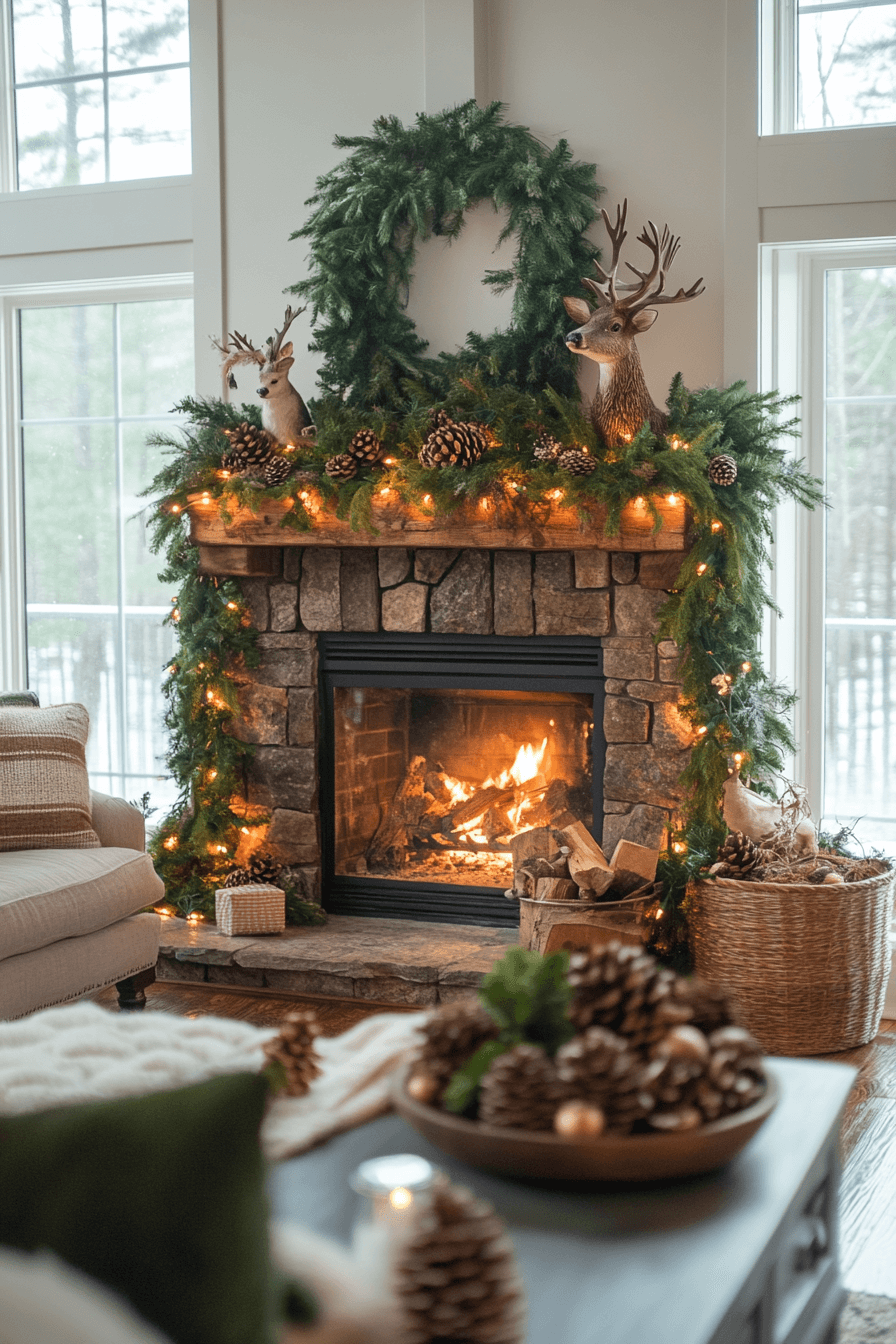 Build a whimsical scene with christmas mantel decor that features miniature woodland animals, pine sprigs, and enchanting natural details. Layering rustic textures with twinkling lights creates a charming, storybook-inspired moment. Soft greenery ties the entire theme together while maintaining a lighthearted feel. This style brings playful magic into every corner of the room.