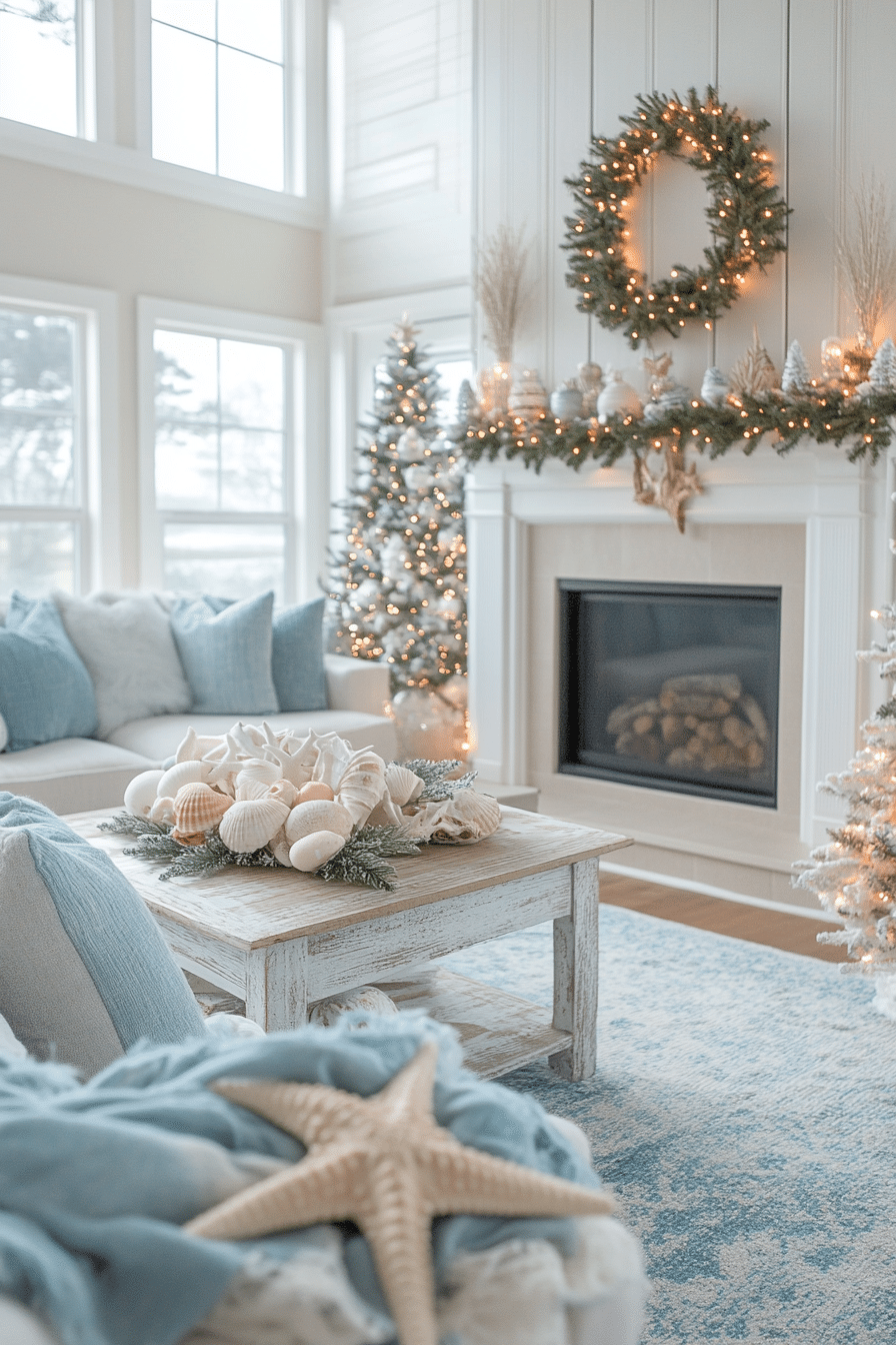 Transform your seasonal display with christmas mantel decor influenced by breezy coastal tones and natural seaside textures. Pale blues, soft whites, and driftwood accents create a light, relaxed holiday mood. Seashell details add uniqueness while maintaining elegance. Gentle illumination enhances the airy atmosphere beautifully.