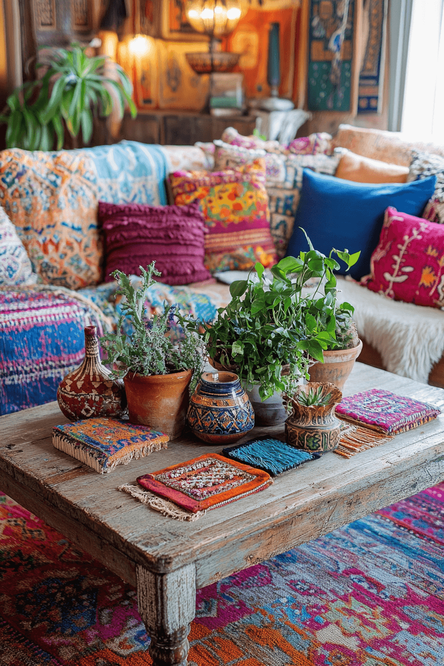 Expressive layers define bohemian coffee table decor ideas full of warmth and creativity. Handmade accents and textured textiles bring personality to the surface. Candles and books add soul and depth. The look feels relaxed and collected. Perfect for free-spirited homes. Infuse personality into your space with coffee table decor ideas that feel artistic and lived-in.
