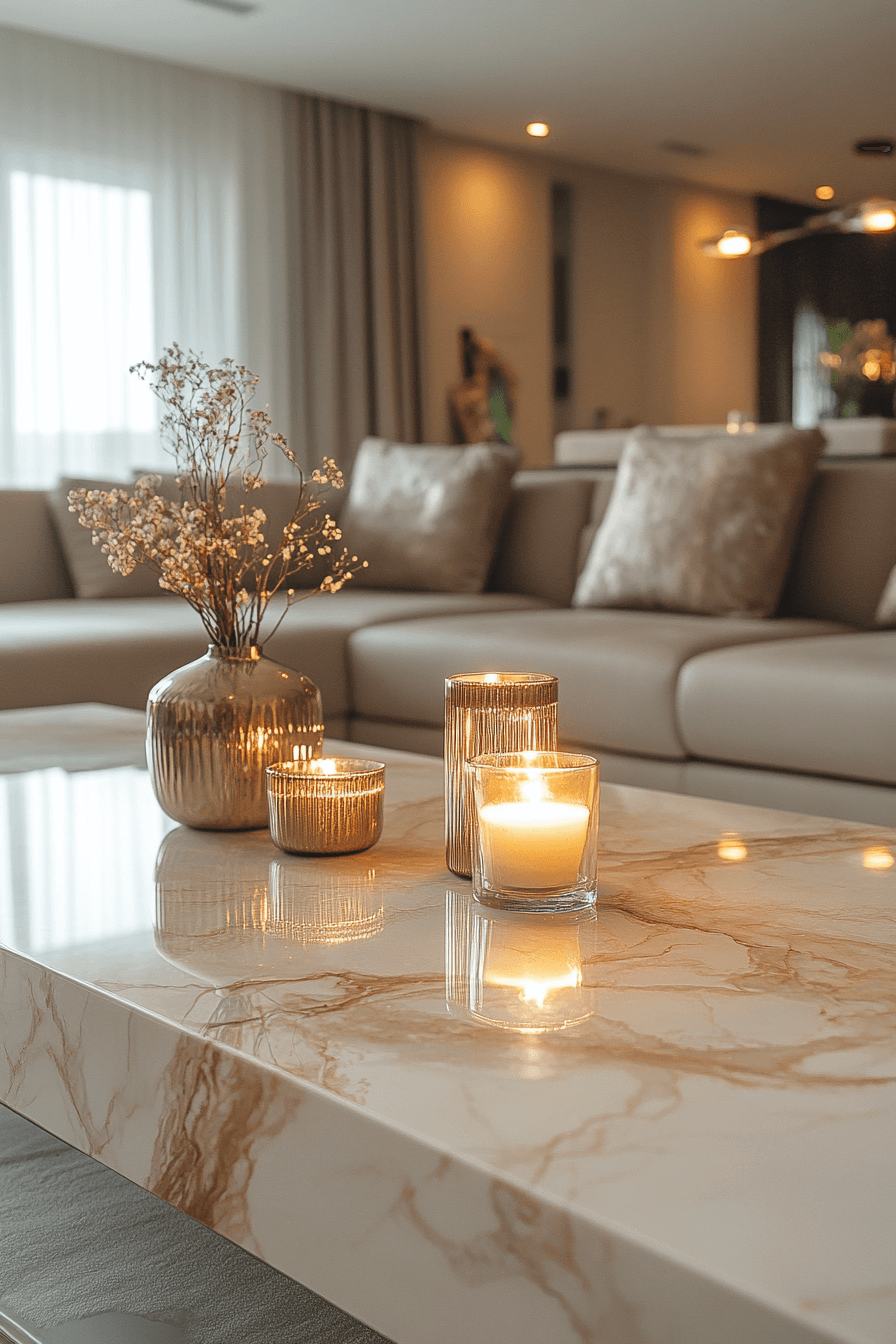 Refined sparkle elevates coffee table decor ideas centered around glam styling. Reflective surfaces and metallic accents brighten the room instantly. Balanced layering keeps the look elegant rather than overwhelming. Each detail feels polished and luxurious. The table becomes a chic focal point. Add instant elegance with coffee table decor ideas that shimmer beautifully.