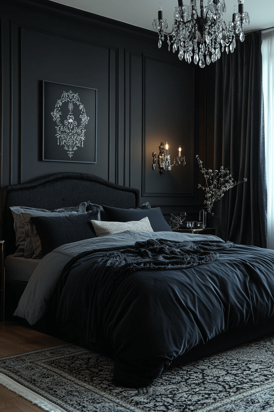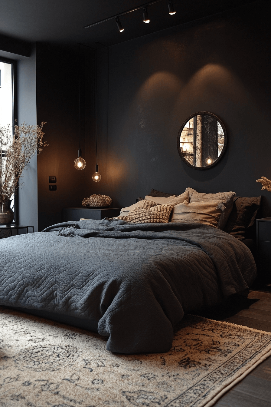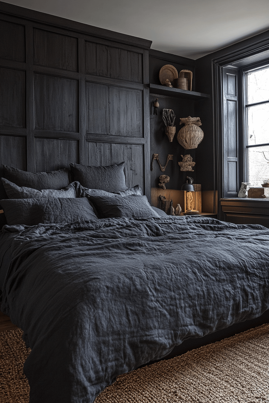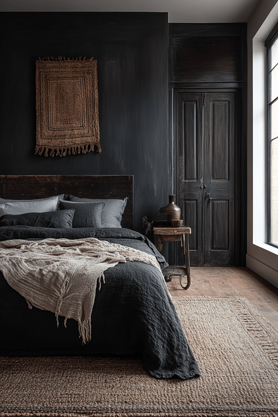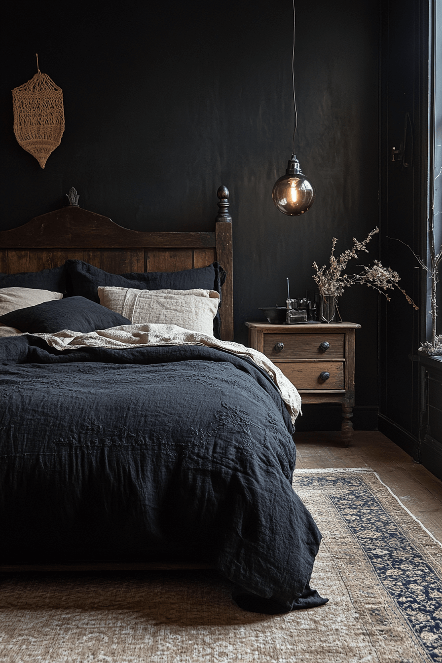 Matte black walls and sculptural furniture bring a curated yet relaxed mood to this dark boho bedroom. Gray bedding softens the boldness of the palette. The style exudes subtle rebellion. Perfect for those who crave quiet drama.
