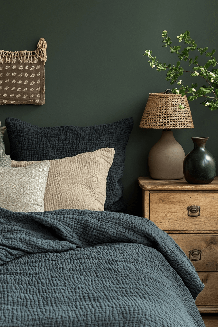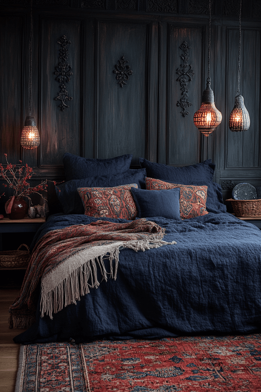 Layered knits, washed linens, and tactile fabrics turn the dark boho bedroom into a haven of texture. Moody walls and low light enhance the sense of intimacy. Every detail invites touch and relaxation. This design leans on feel over ornamentation.