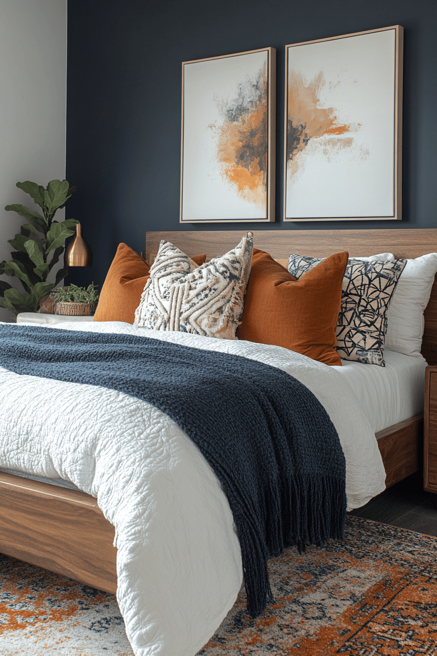 Amber accents and stone-gray tones blend into a balanced dark boho bedroom. Sculptural pieces and layered fabrics create interest and depth. The palette is bold yet welcoming. Great for fans of striking contrasts.