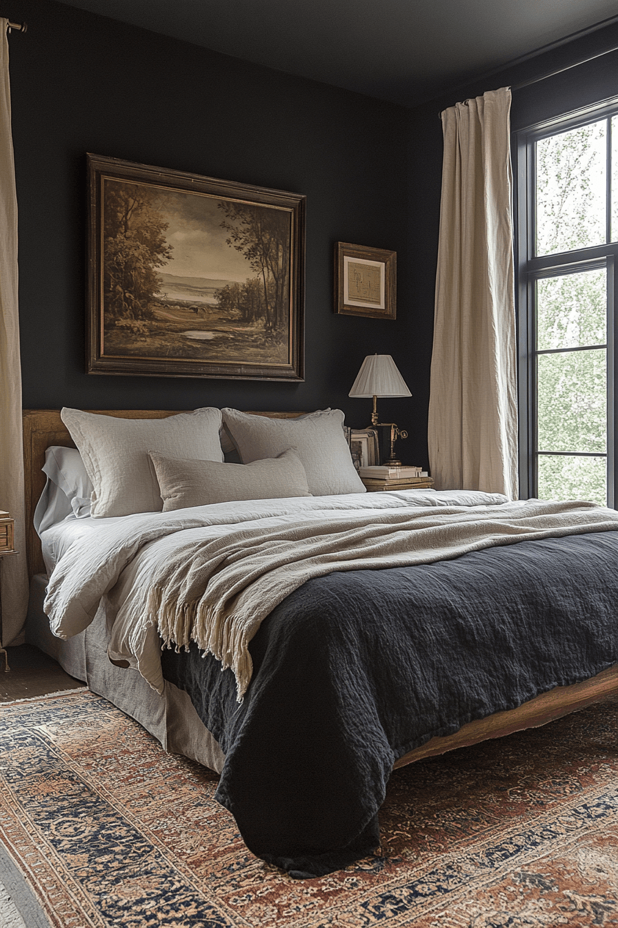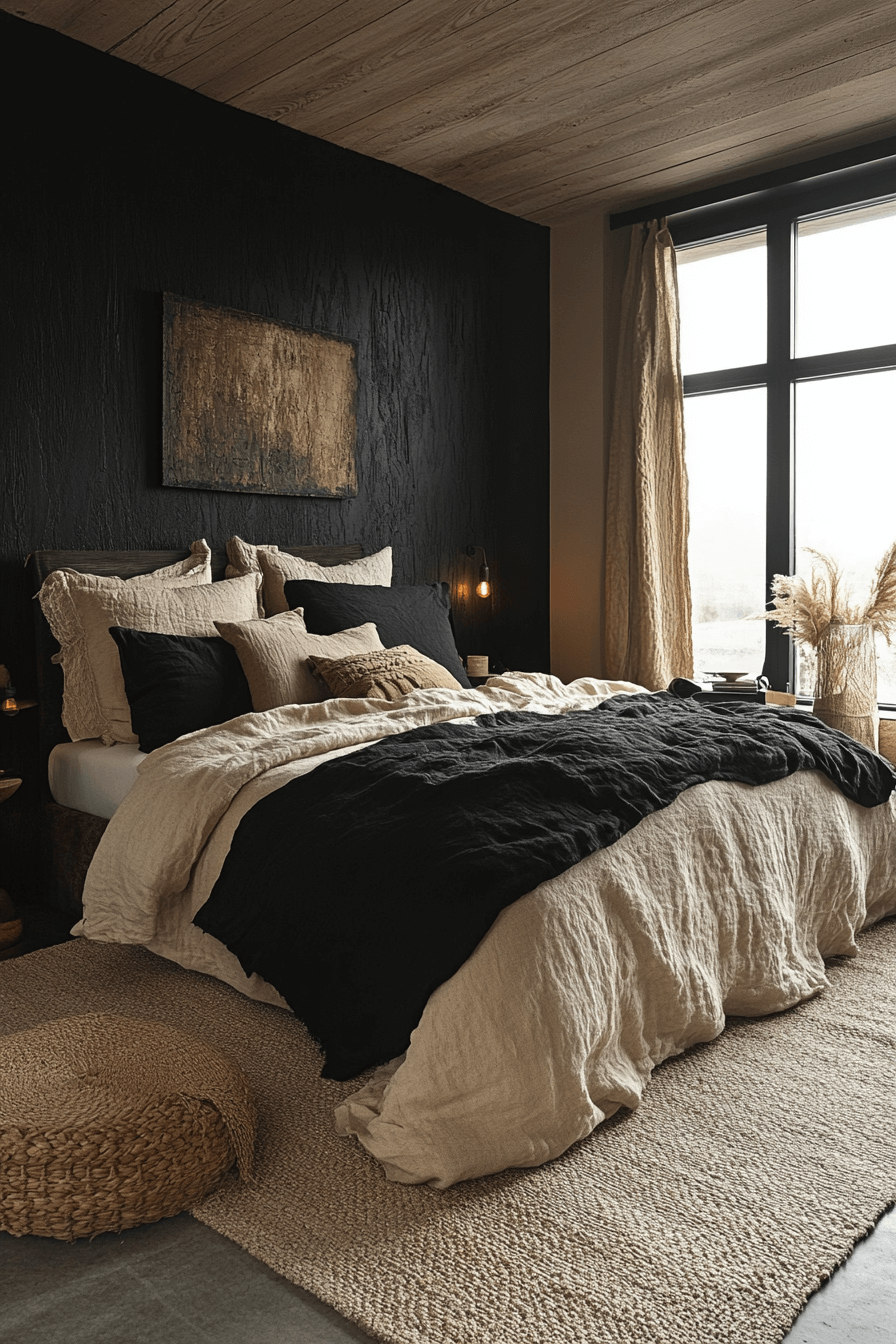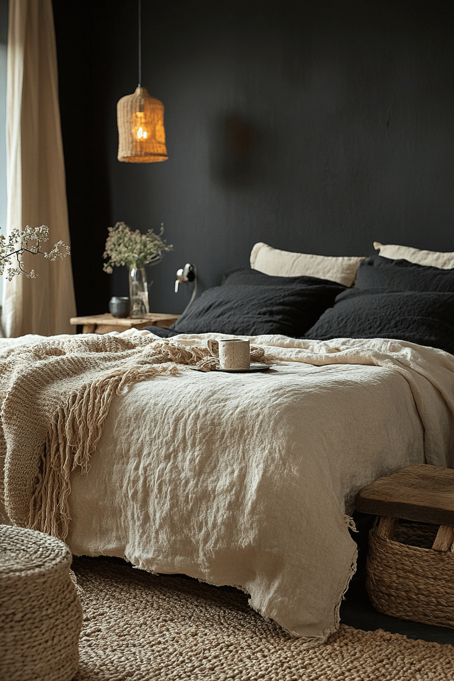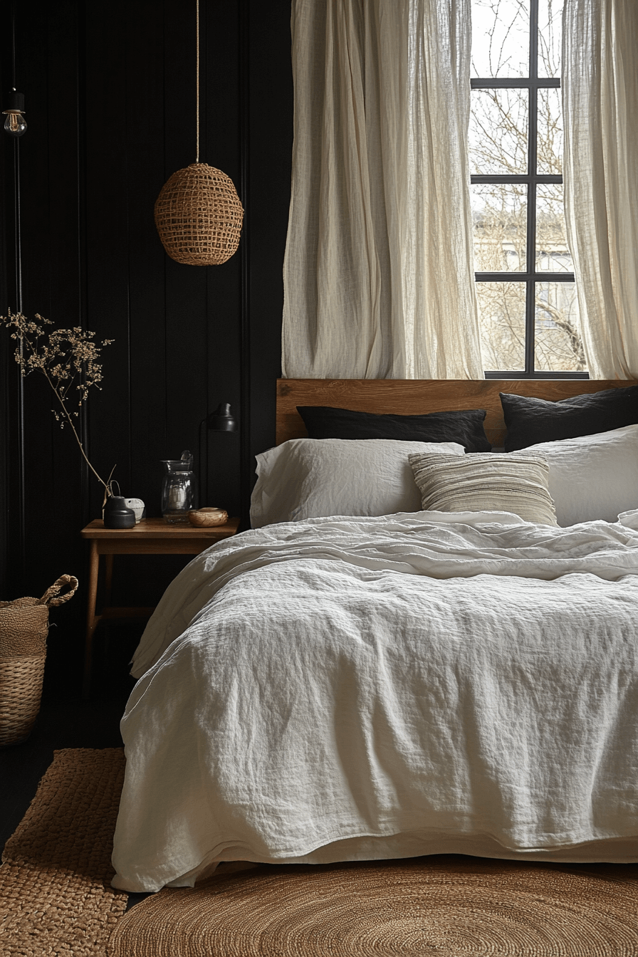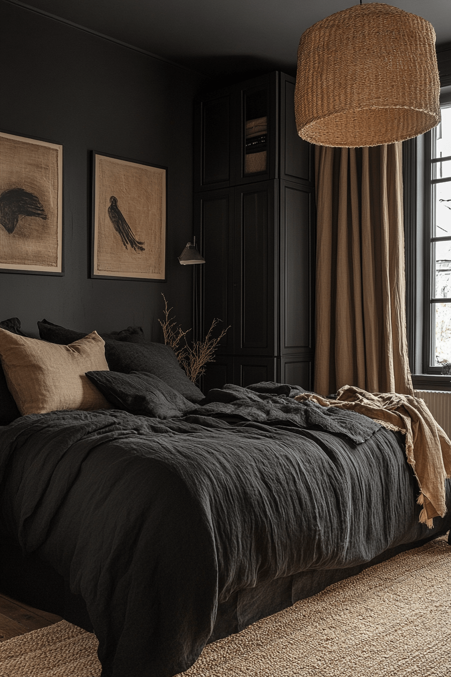 Blackened tones meet airy neutrals in this sleek dark boho bedroom. Crisp shapes contrast with inviting textures. The balance creates moody clarity. Perfect for those who want minimalism with depth.