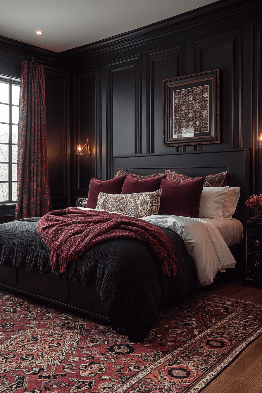 Bold black tones mingle with layers of soft textiles to shape a dark boho bedroom full of contrast and warmth. Deep shades and streamlined furniture set a moody stage while textured accents keep the space rich. Charcoal bedding, dark wood, and cozy throws invite comfort without losing edge. The result is a room that feels both grounded and dramatic.