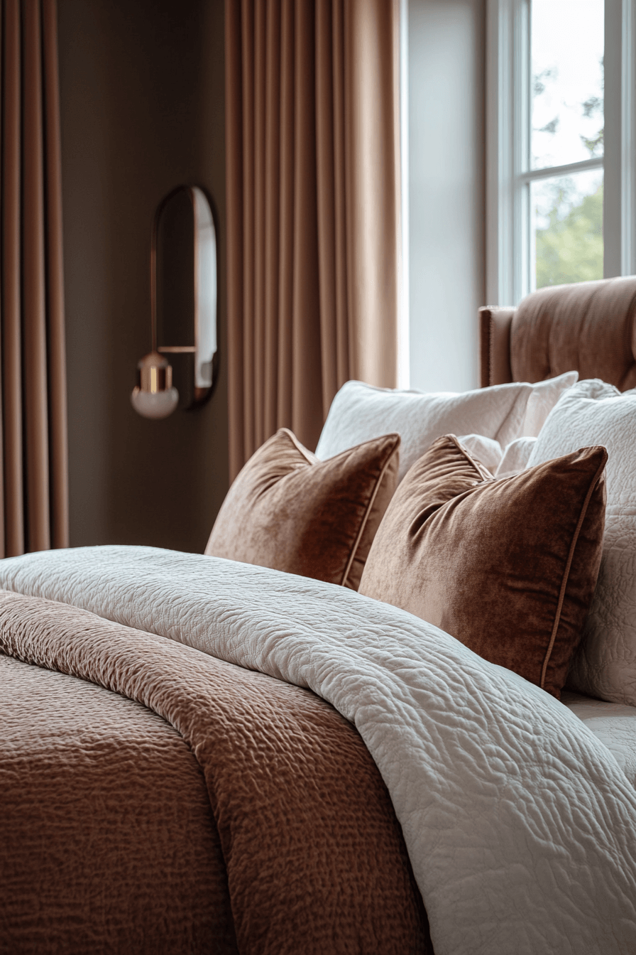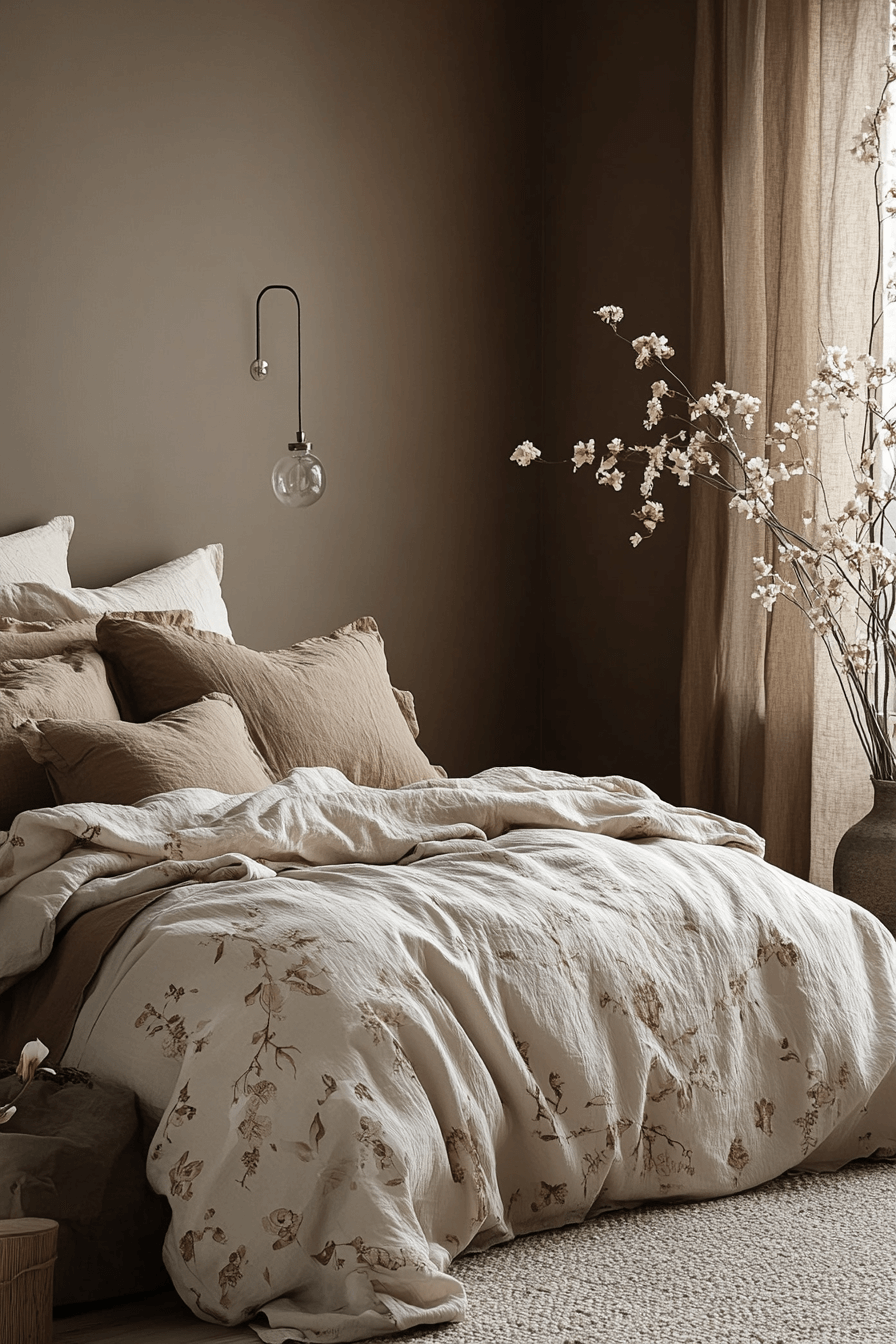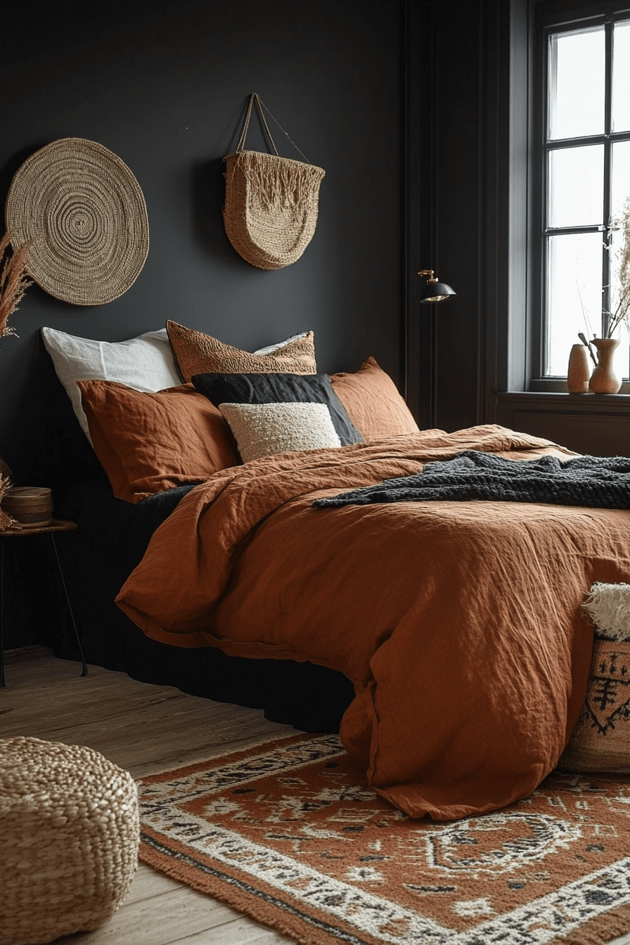 Brown and rust hues create a toasty, moody vibe in this dark boho bedroom. Matte finishes keep it modern, while textures add richness. The space feels bold yet welcoming. Great for those who crave warmth in design.