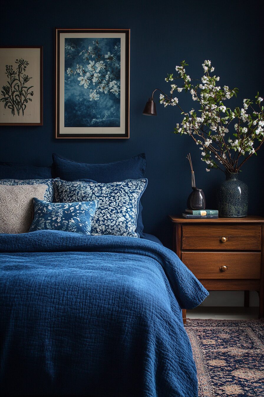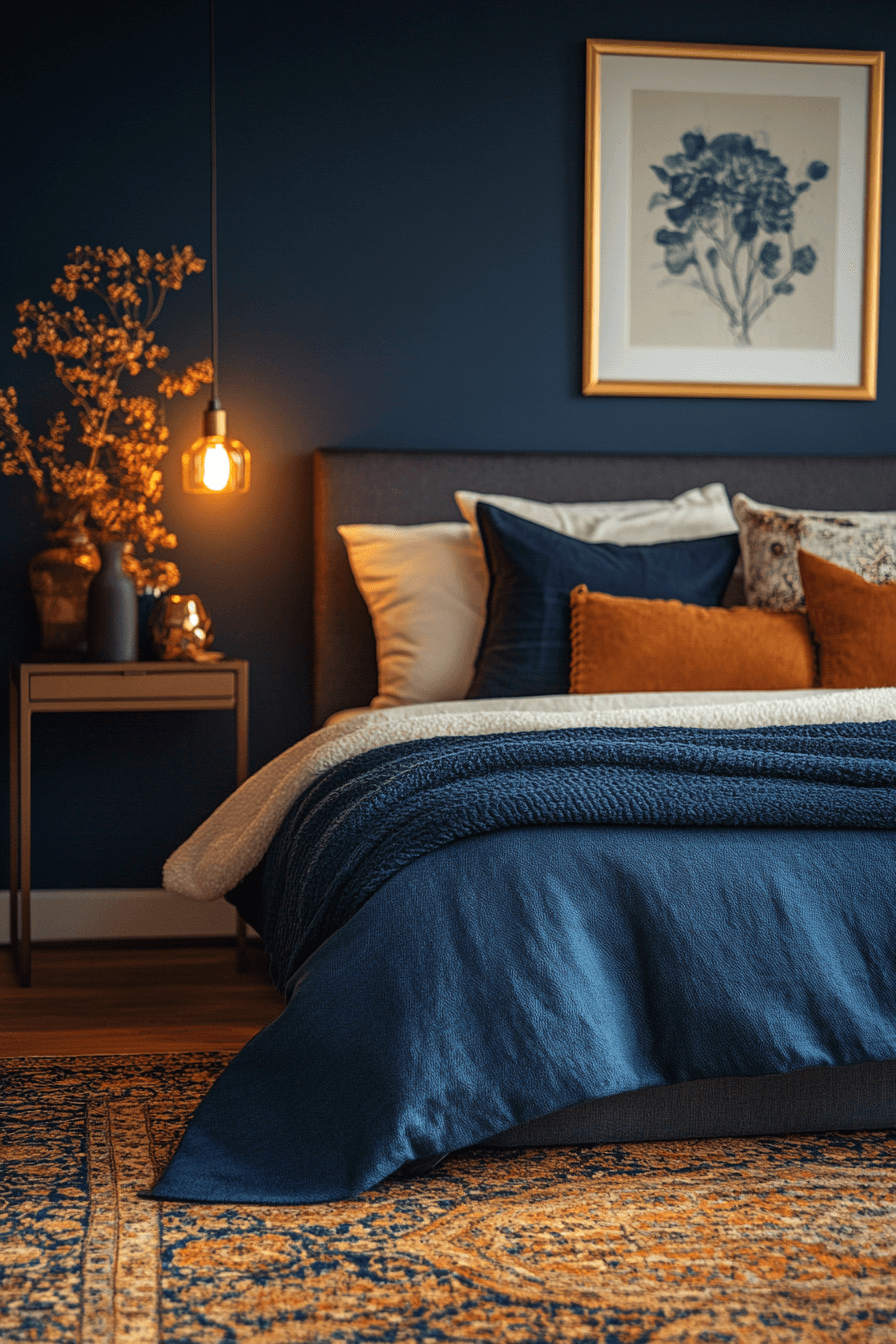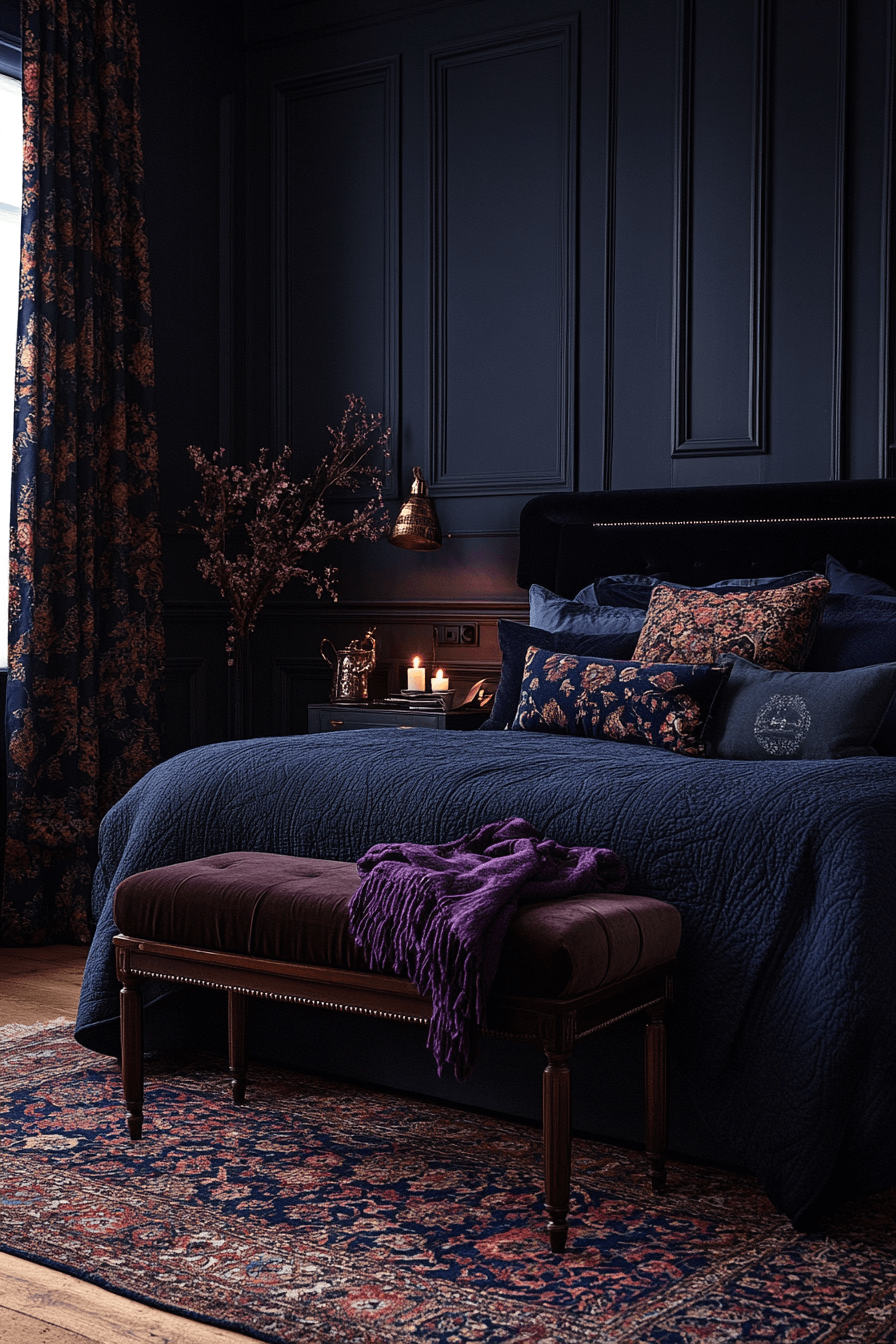 Navy, slate, and deep violet cocoon this dark boho bedroom in rich drama. A low, minimalist bed anchors the room, while plush bedding adds comfort. Rounded accents and soft glows create intimacy. It’s perfect for night owls and creative thinkers.