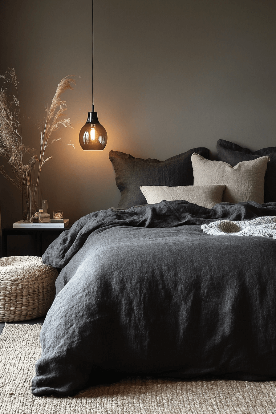 Charcoal walls and soft textures give this dark boho bedroom an artful edge. Layered bedding and diffused lighting create depth and warmth. Subtle patterns repeat for visual harmony. The result is soulful and inviting.