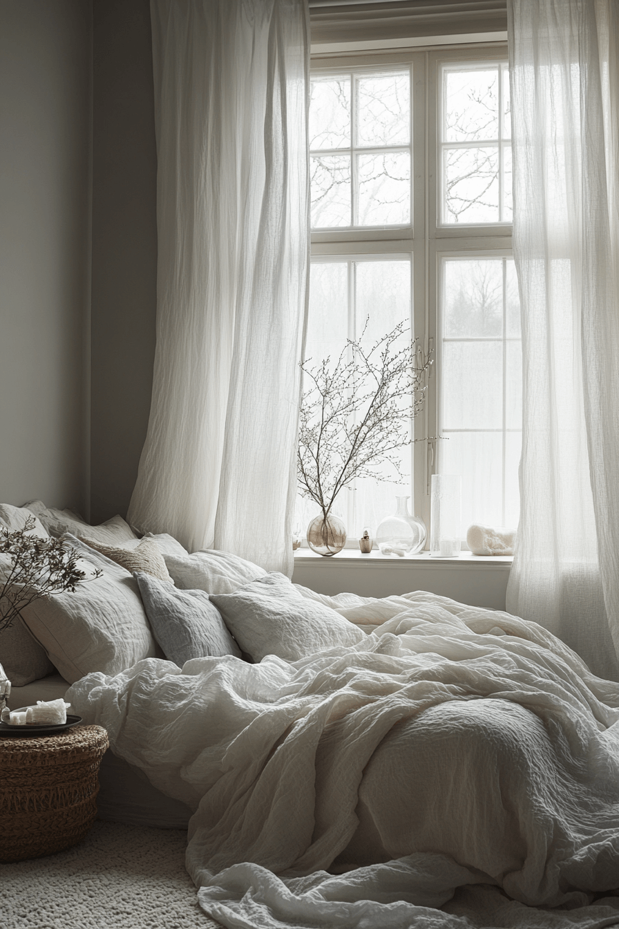 Foggy grays and muted mauves wrap this dark boho bedroom in softness. Curved decor and flowing fabrics make it peaceful. The palette whispers rather than shouts. A dream for lovers of understated moody design.