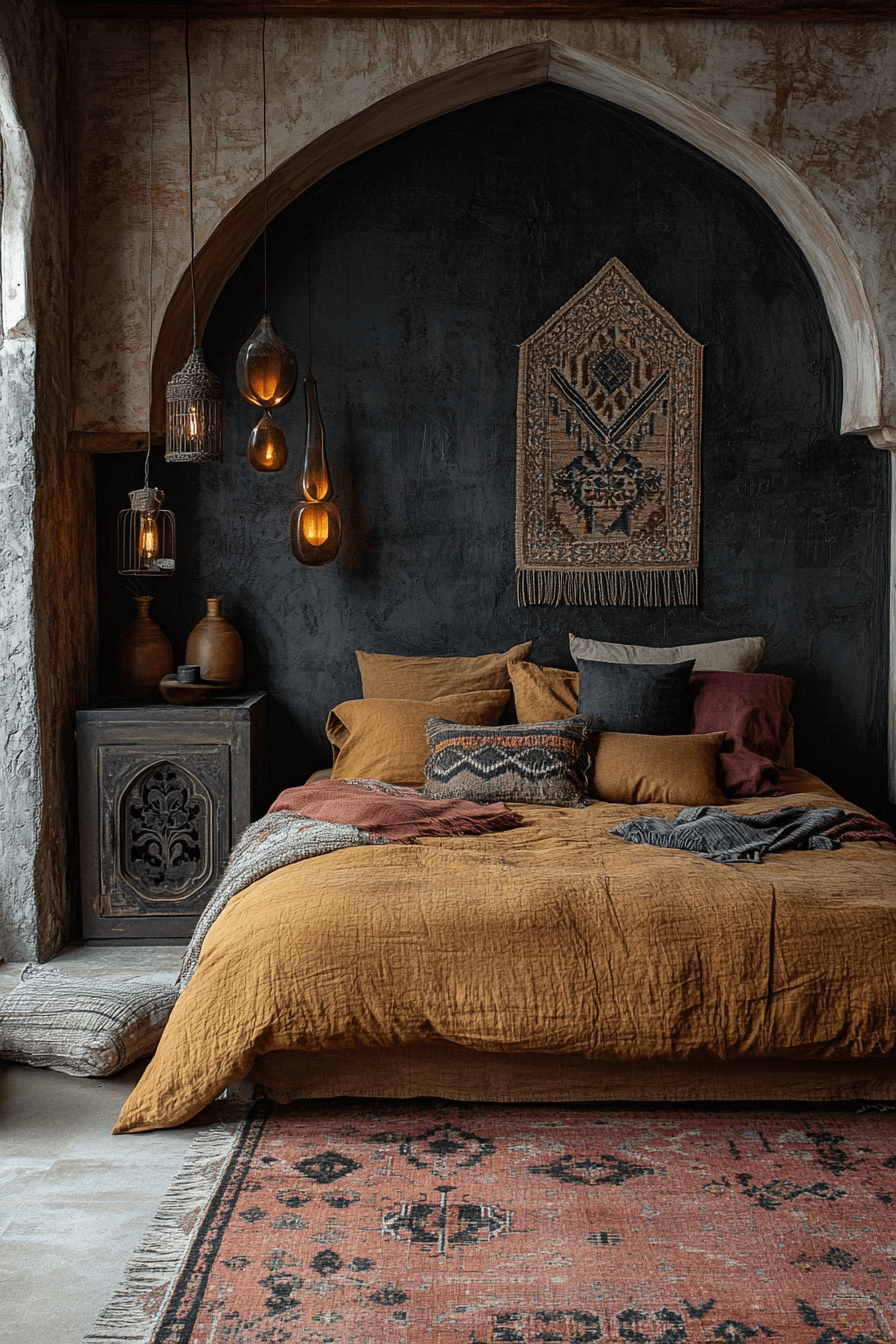 Nomadic touches and shadowy hues bring character to this inviting dark boho bedroom. Textured rugs, artisan furniture, and earthy tones blend into a harmonious retreat. Black, smoky gray, and rust create layers of depth without overwhelming the senses. It’s a space for dreamers and collectors alike.