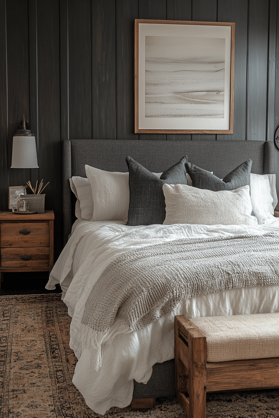 Soft neutrals meet moody depth in this peaceful dark boho bedroom. Charcoal bedding pairs effortlessly with light woods and subtle metallic accents. Clean lines maintain a sense of order while plush details keep it warm. Perfect for those who love quiet sophistication.