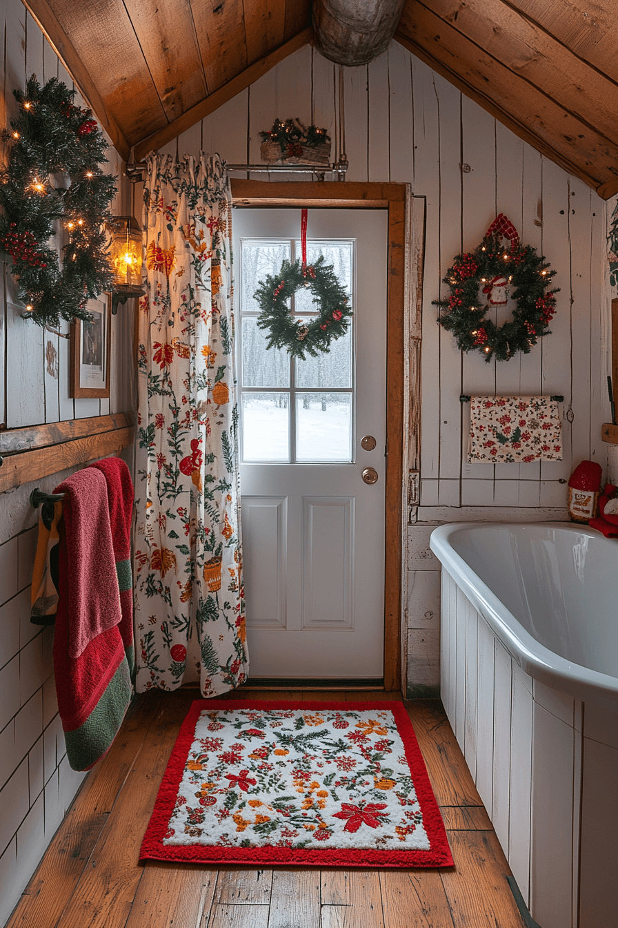 Bring festive sparkle to your bathroom and let it shine with little cabin Christmas joy. Frosted accents, bright lights, and cozy linens make it gleam with holiday happiness. Even small details bring big smiles. The warmth of soft light fills every corner.