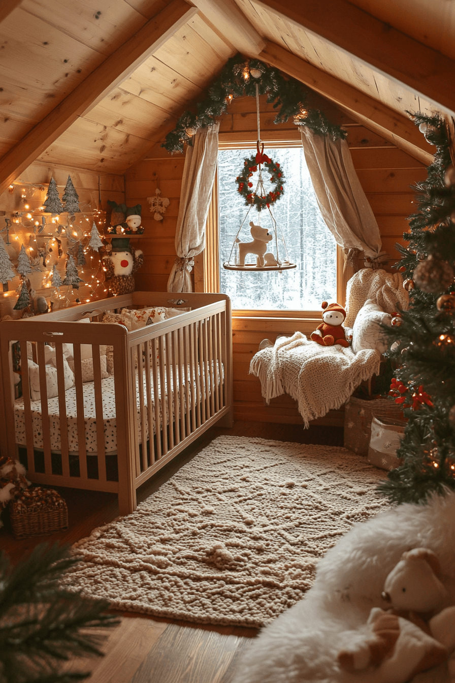 Your baby’s room glows like a fairytale with touches of little cabin Christmas warmth. Gentle lights, plush textures, and soft music create peaceful perfection. A tiny tree sparkles softly in the corner. Every giggle feels like magic wrapped in love.