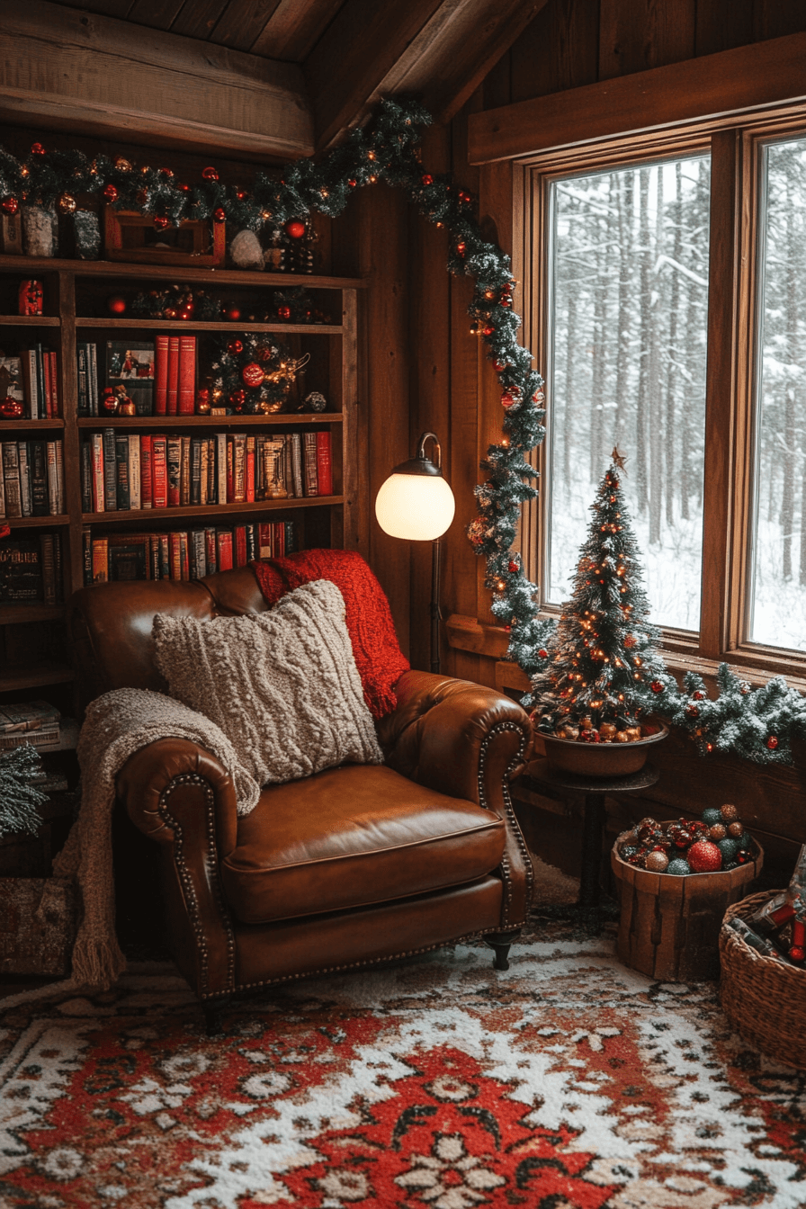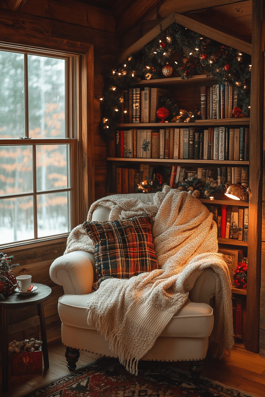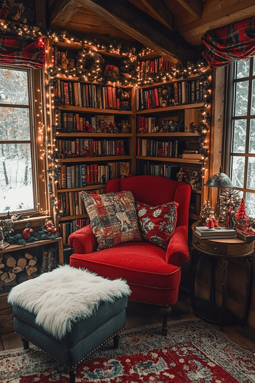 Escape into quiet bliss in a book nook glowing with little cabin Christmas charm. Twinkling fairy lights frame shelves lined with favorite reads. A warm blanket and steaming mug complete the moment. Snowflakes outside seem to fall in rhythm with your story.