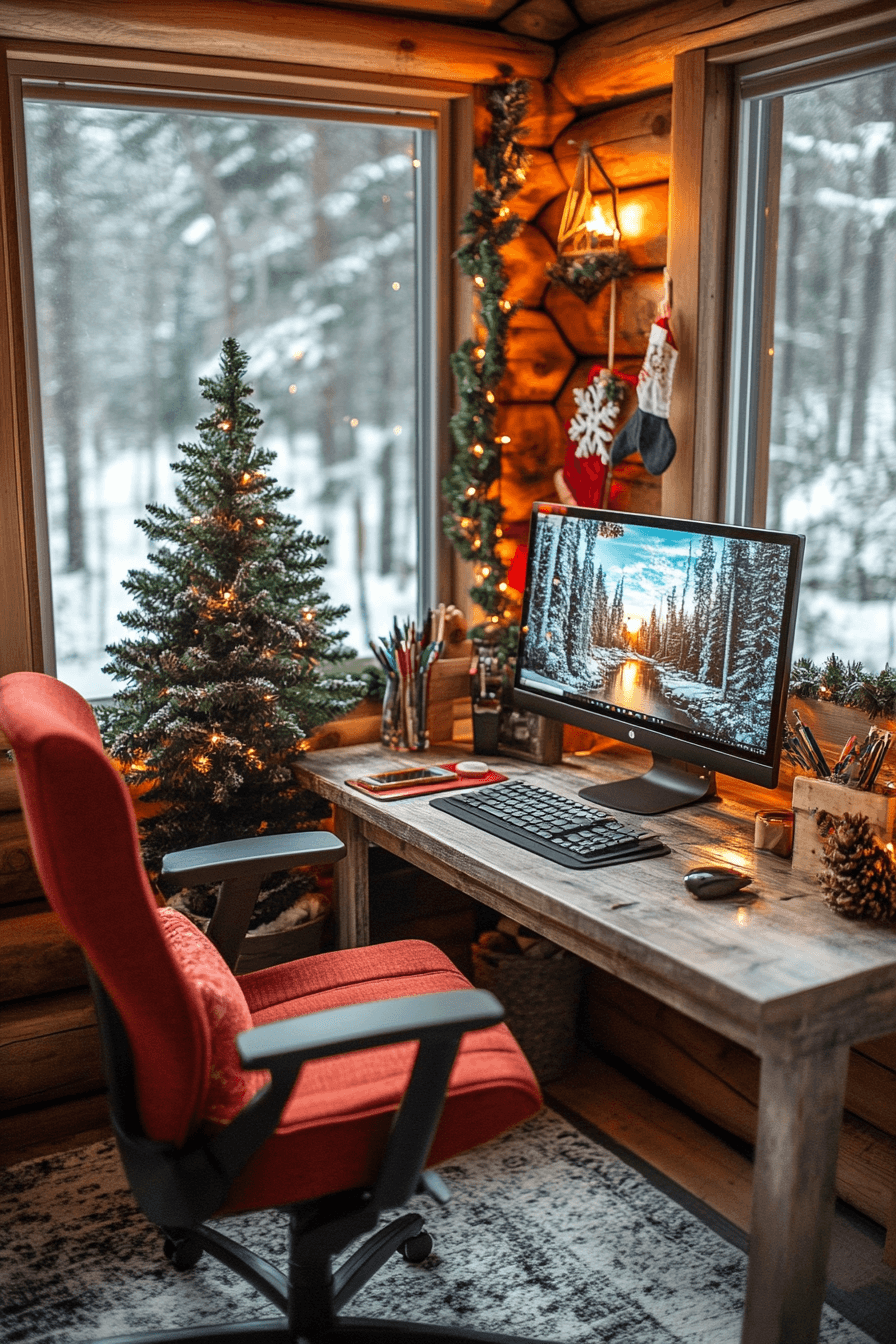 Let productivity meet joy in your home office glowing with little cabin Christmas spirit. Garlands twine along your desk, and warm light sets the perfect mood. A small tree sparkles near your keyboard. Every project feels purposeful and calm.