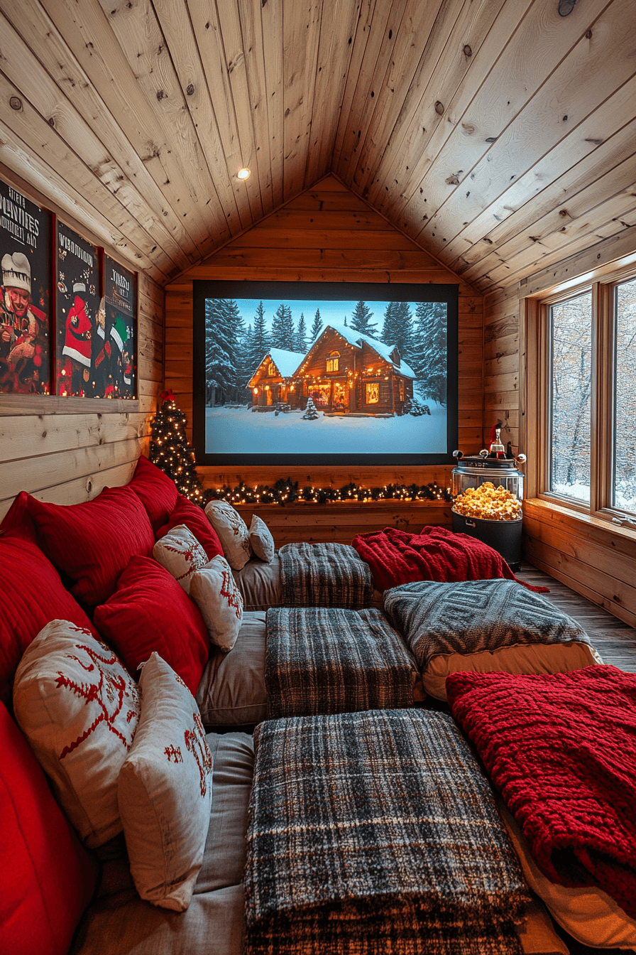 Your living space becomes the ultimate movie retreat during your little cabin Christmas evenings. Plush sofas, warm blankets, and string lights make the perfect setting. The smell of popcorn fills the air while classic films play. Every scene feels magical in the flicker of candlelight.