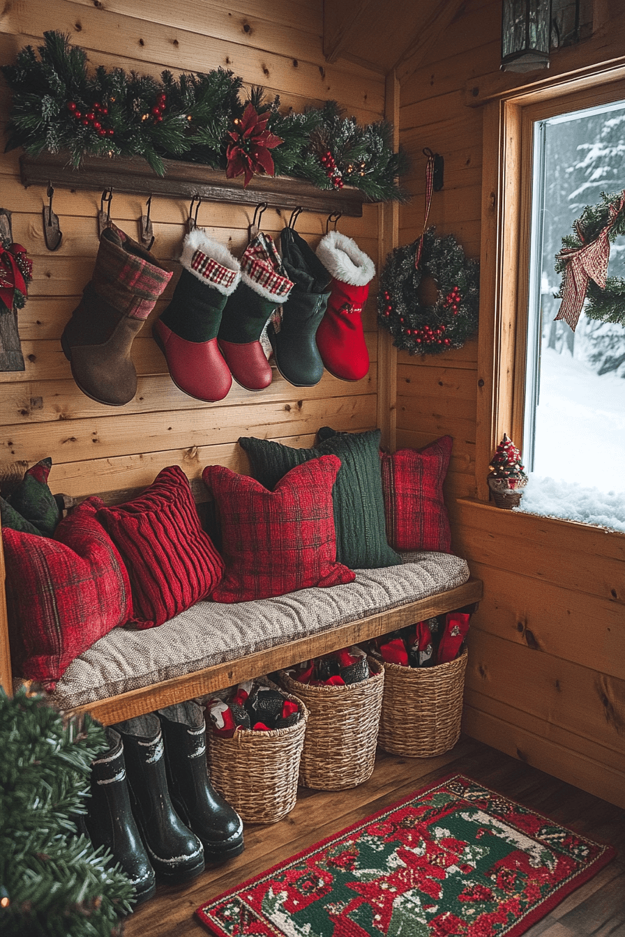 The mudroom glows with rustic cheer in your little cabin Christmas home. Woven baskets, festive mats, and pine wreaths add cozy order. Even boots and coats look charming under twinkling light. The space feels tidy yet joyful.