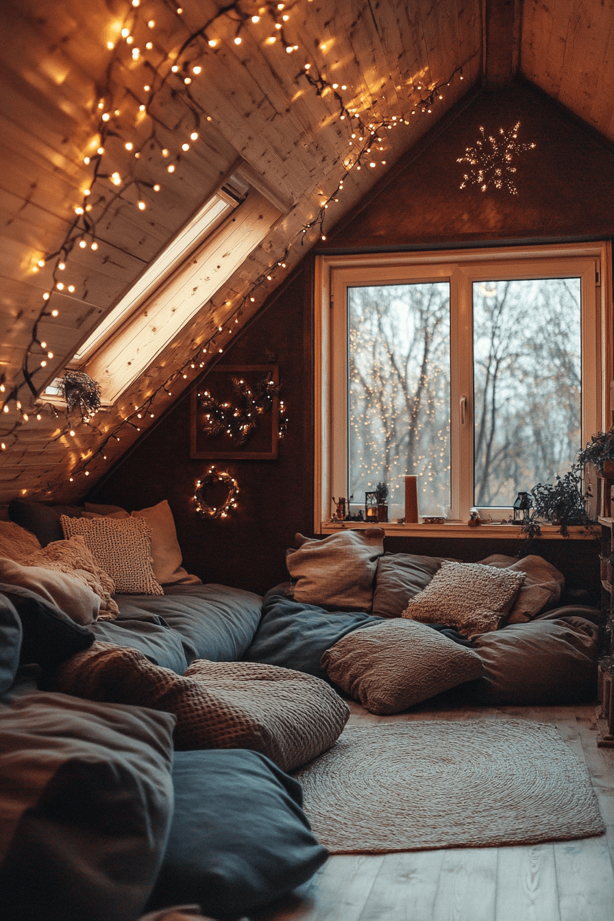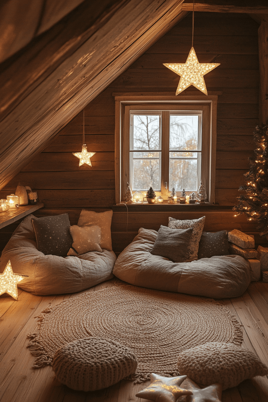 Your attic sparkles with quiet wonder during your little cabin Christmas celebration. String lights dance across wooden beams, creating soft, glowing magic. Blankets and pillows turn the space into a dreamy hideaway. The peaceful hush above the house feels like a secret holiday haven.