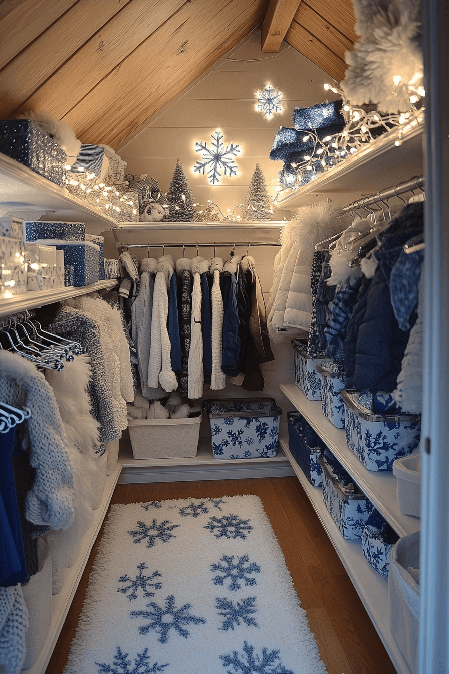 Even your closet can feel festive during your little cabin Christmas. Garlands, twinkle lights, and snowflake bins add joyful order. Every sweater and scarf looks special under the glow. The space feels warm and bright, not just functional.