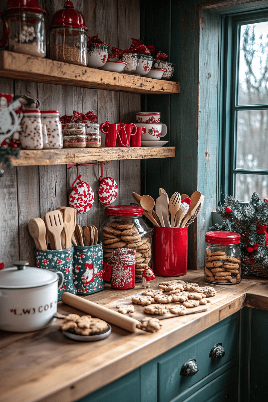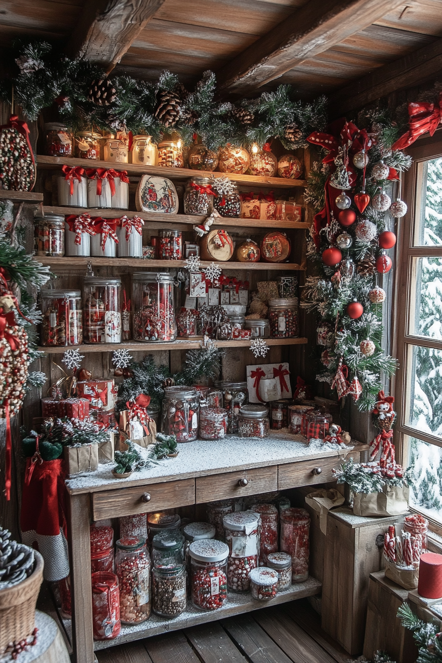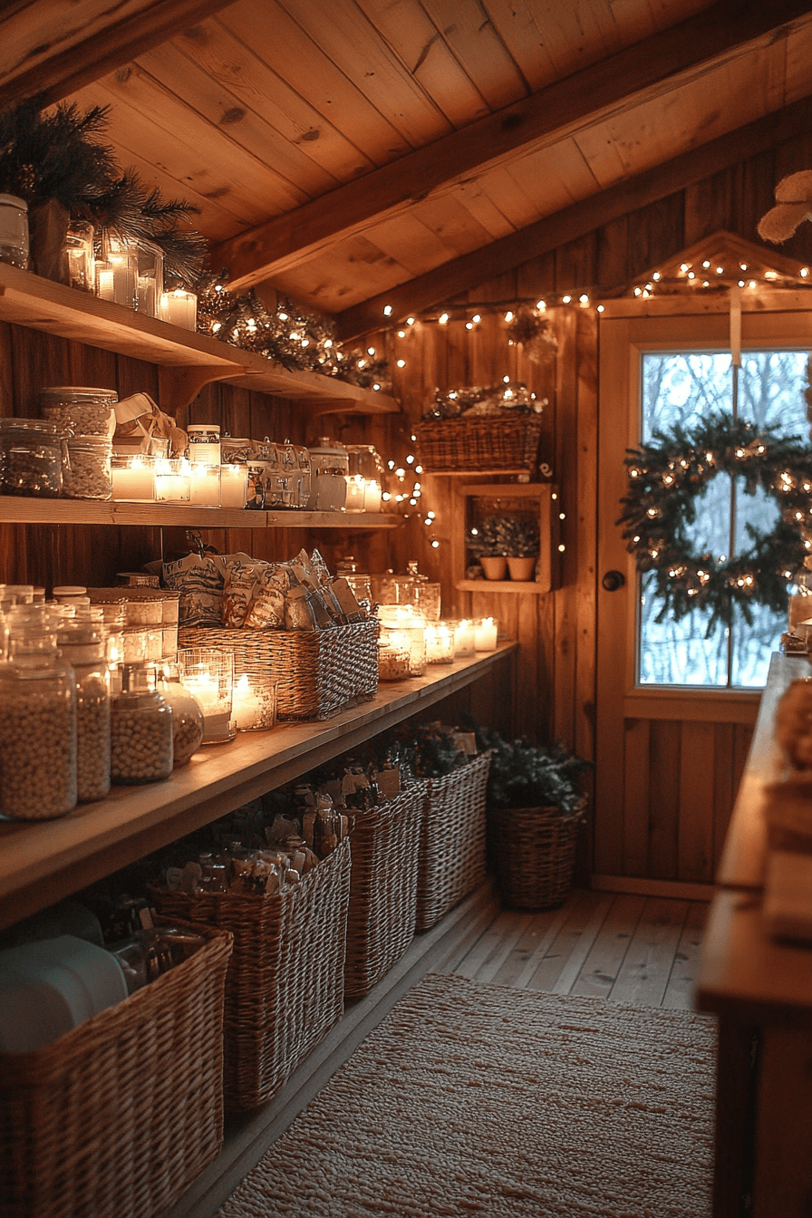The pantry glows with golden light and sweet charm during your little cabin Christmas. Candle jars, ribboned baskets, and pine accents turn storage into style. The soft scent of cinnamon fills the air. Every shelf feels like a cozy surprise.