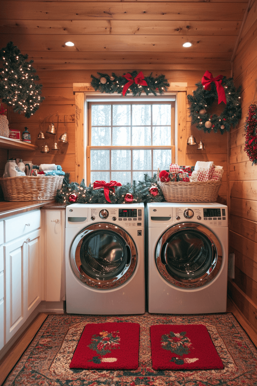 Even laundry day feels merry when surrounded by the glow of your little cabin Christmas. Red towels, holiday signs, and garlands bring joy to chores. The scent of fresh pine makes folding feel fun. Every load feels lighter in a cheerful space.
