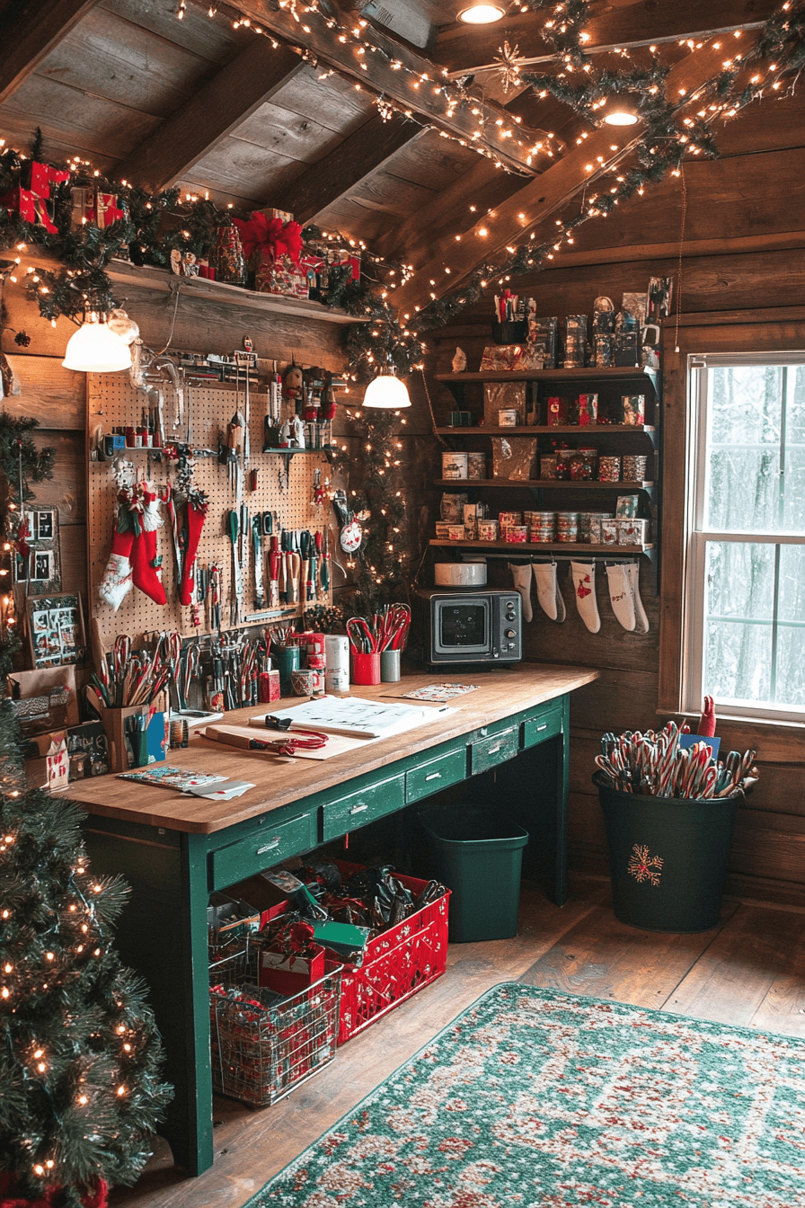 The garage transforms into a workshop buzzing with your little cabin Christmas energy. Tables covered in ribbons, wrapping paper, and gifts set a festive tone. Music and laughter echo as you wrap surprises for loved ones. Even the scissors seem to sparkle in the glow.