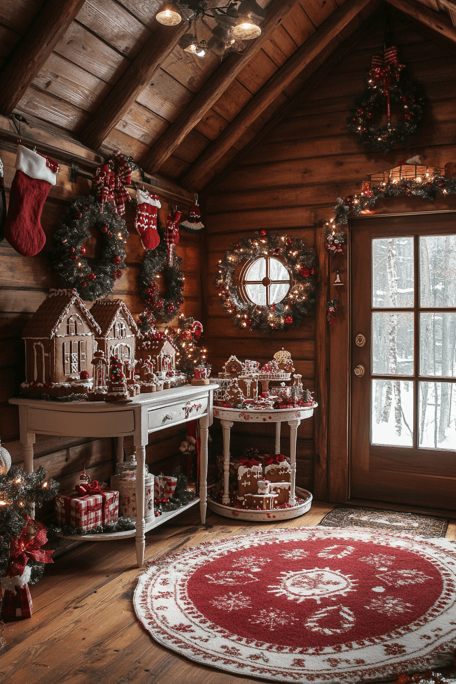 Guests are greeted by a delicious aroma and glowing charm in your little cabin Christmas foyer. Candy canes, gingerbread scents, and golden lights make a dreamy welcome. Every corner feels sweet and joyful. The air hums with happiness.