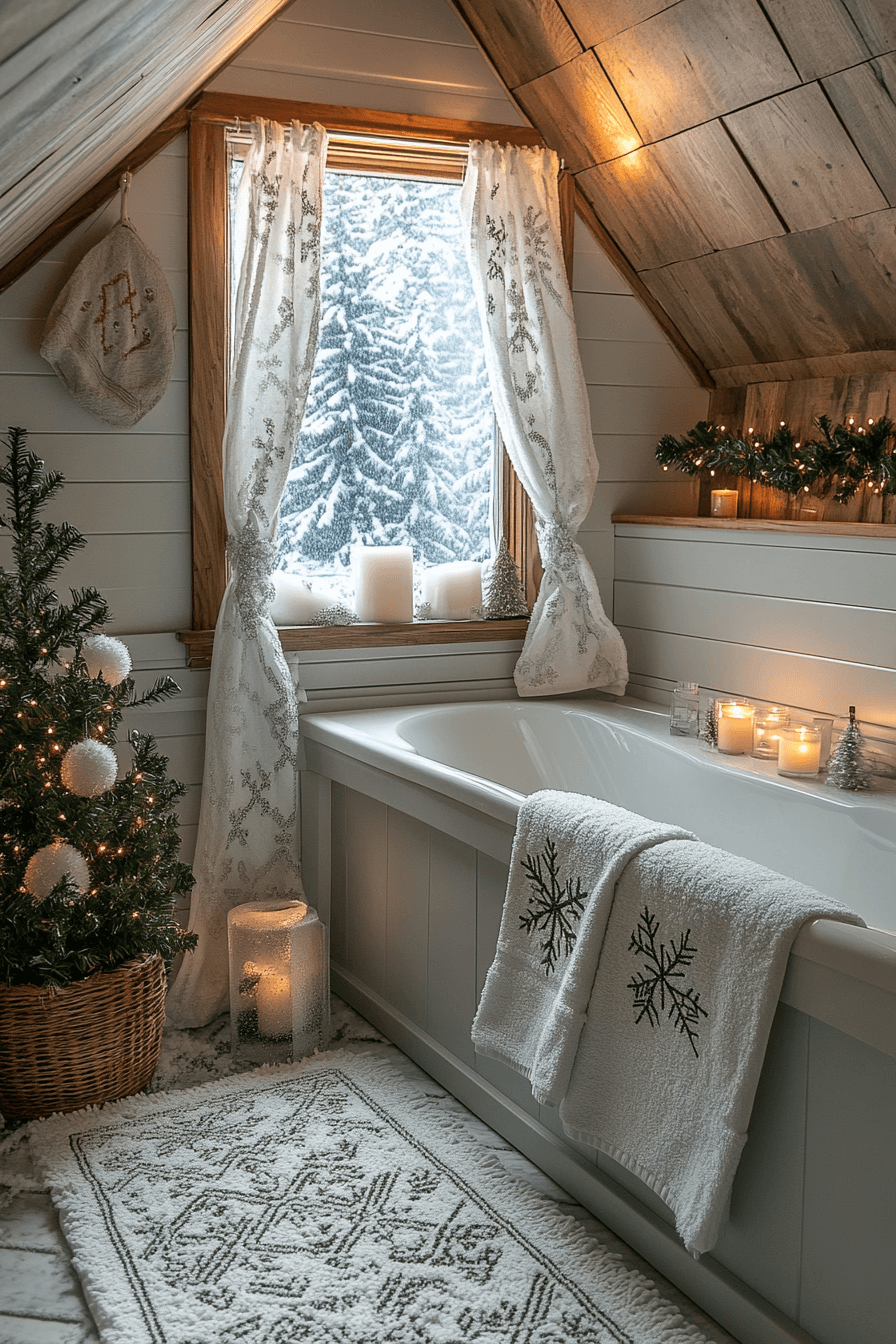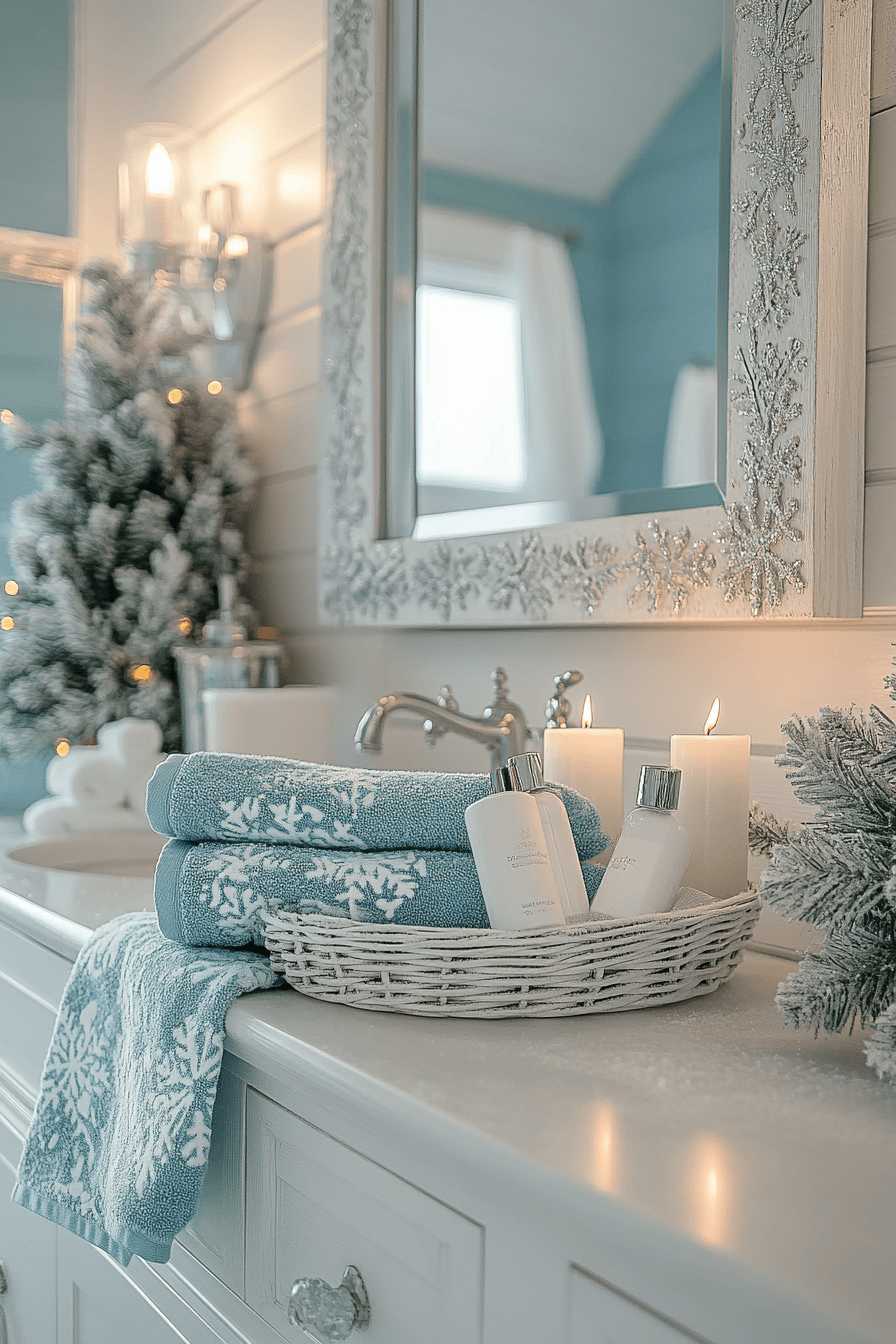 Turn your bathroom into a snowy retreat during your little cabin Christmas celebration. Soft blues and silvers shimmer under candlelight. The air feels fresh, crisp, and calm. Each glance feels like stepping into winter’s beauty.