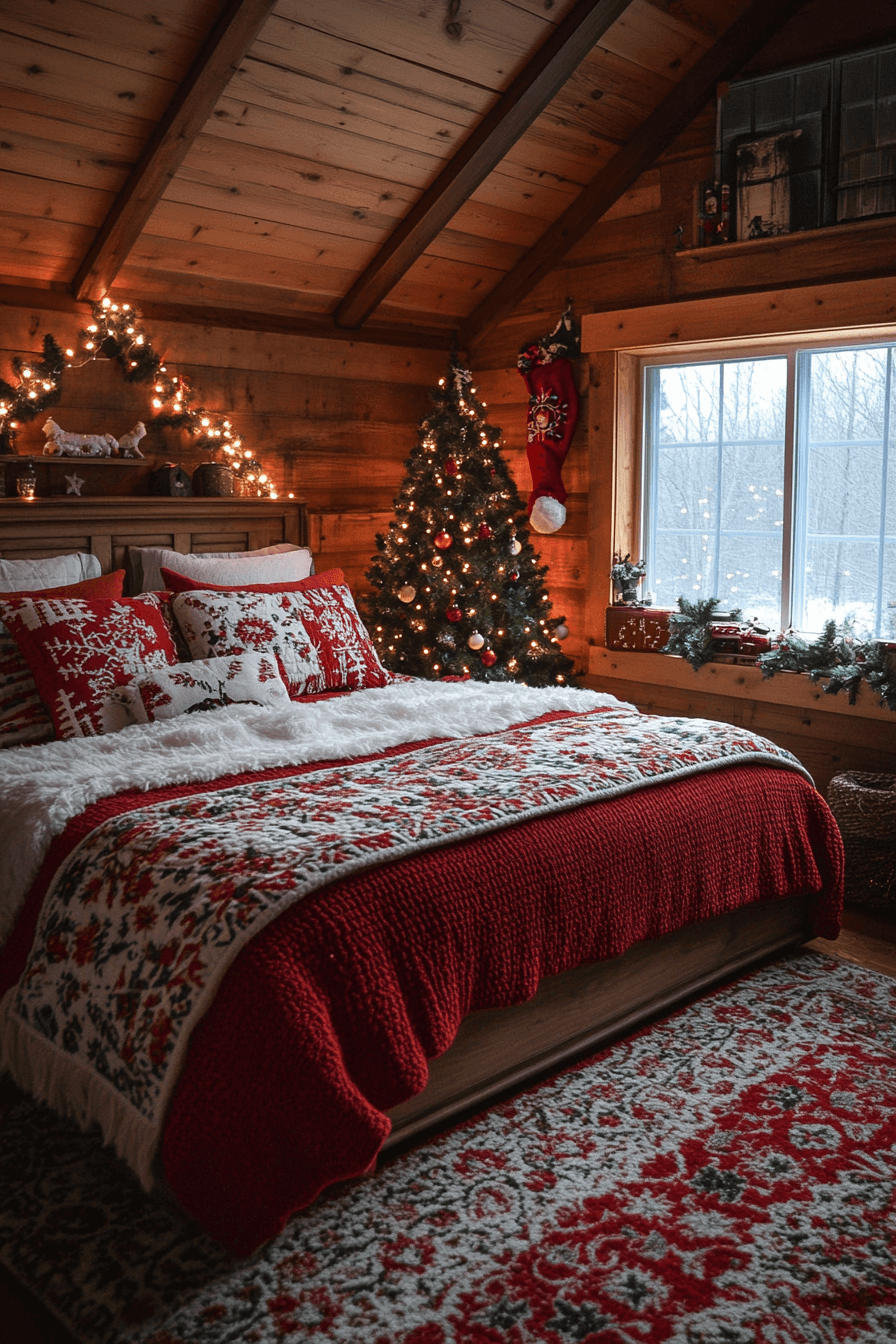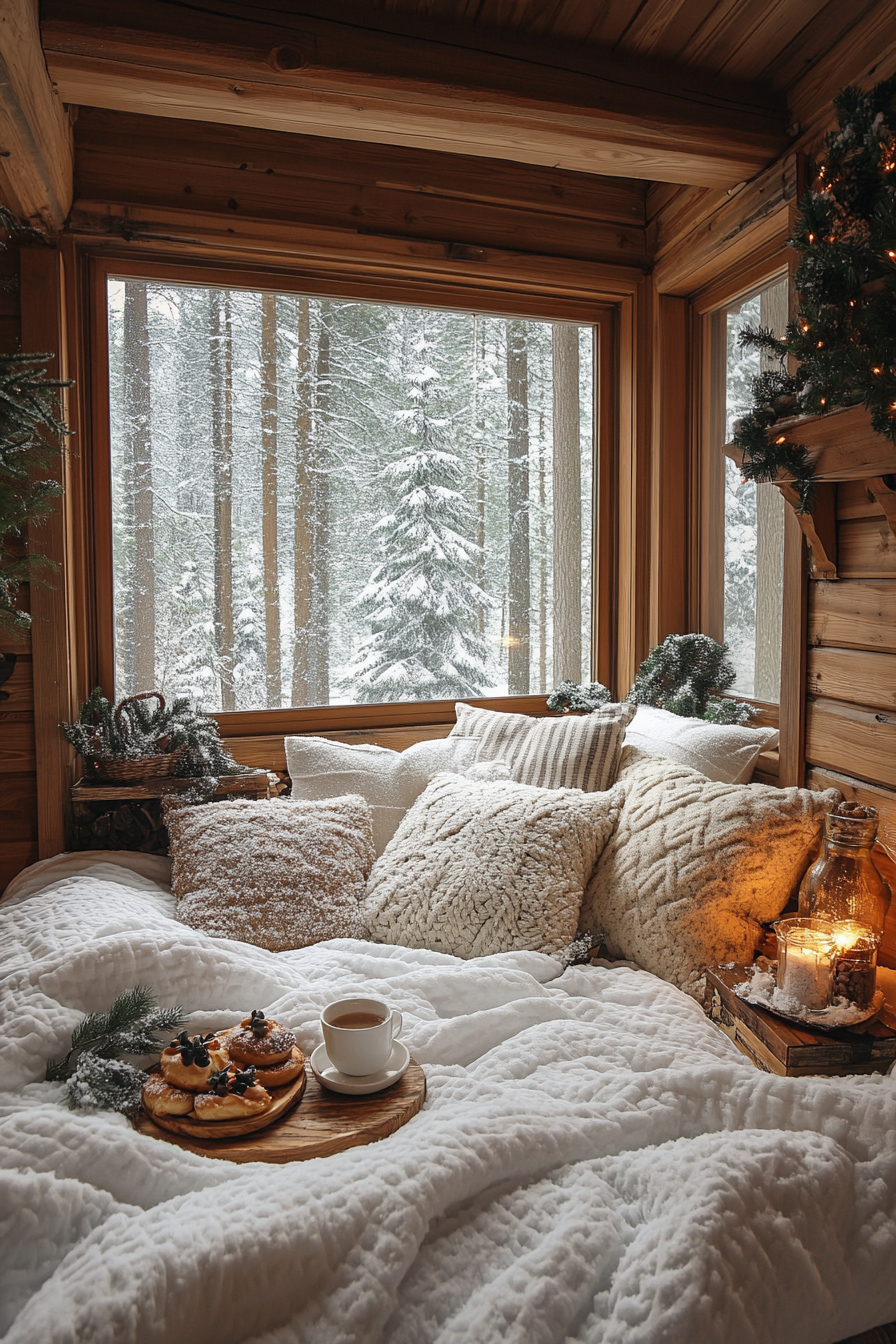 Turn your bedroom into a soft winter retreat wrapped in the charm of a little cabin Christmas. Plush blankets, golden lights, and the scent of pine create the perfect escape. The peaceful glow invites rest after joyful days. Snow outside your window completes the dream.