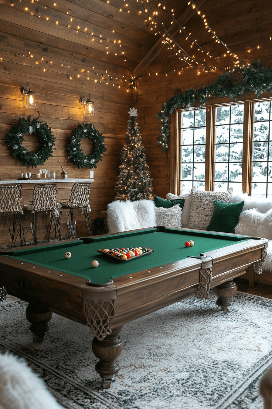 Let your game room burst with laughter and light this little cabin Christmas. Garland-wrapped lights and holiday music create the perfect gathering spot. Cocoa mugs and playful energy fill the air. Every roll of the dice brings a little more cheer.