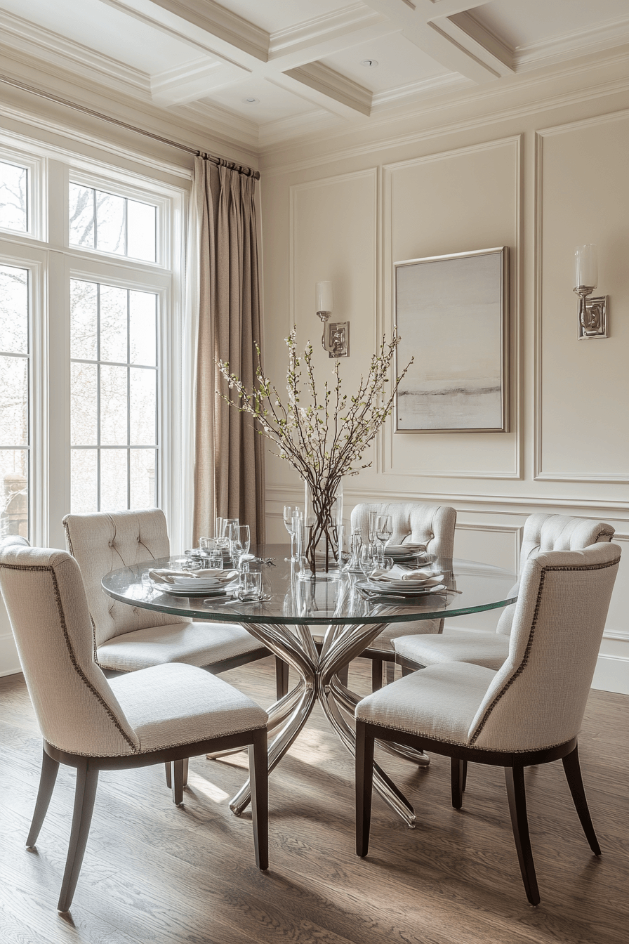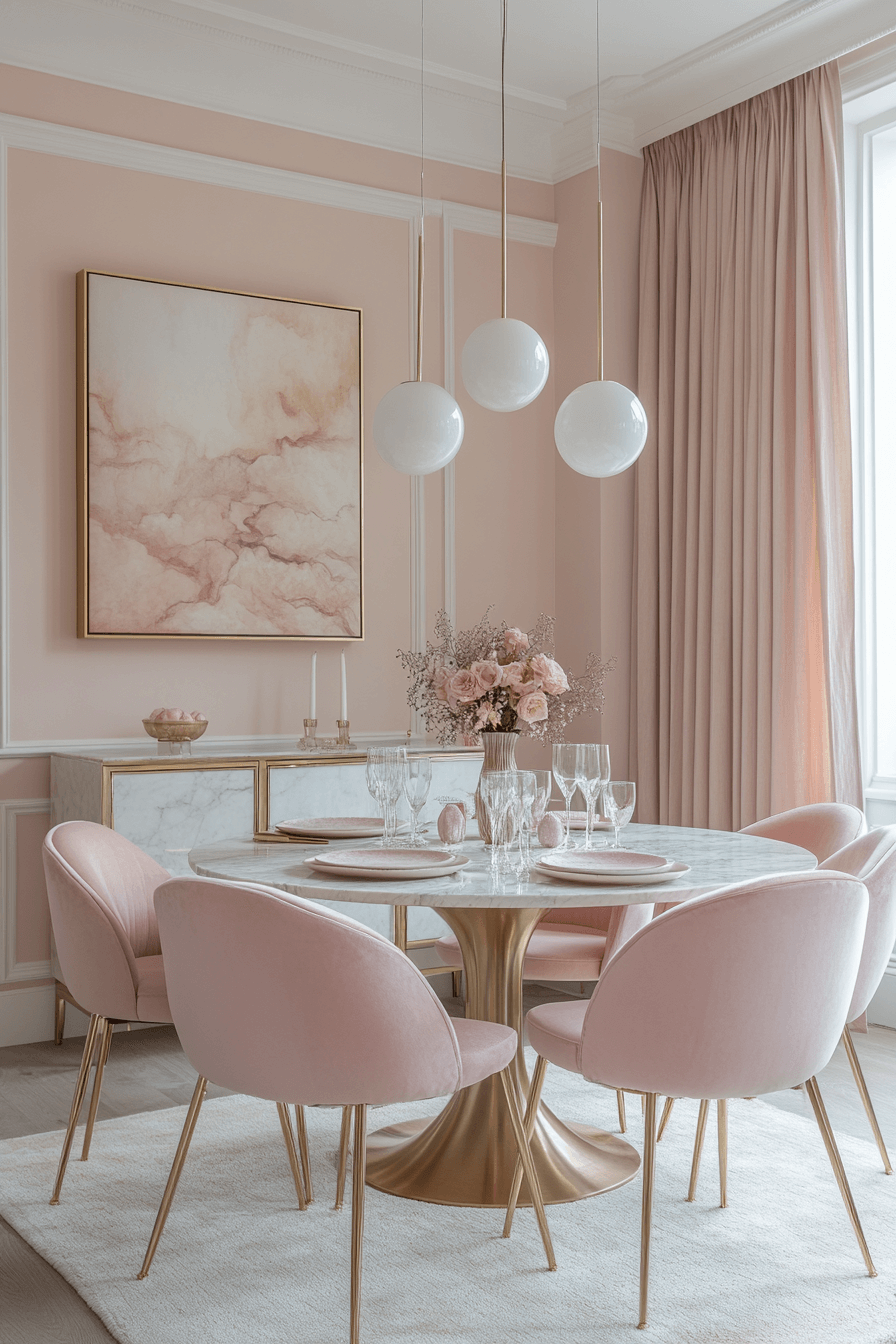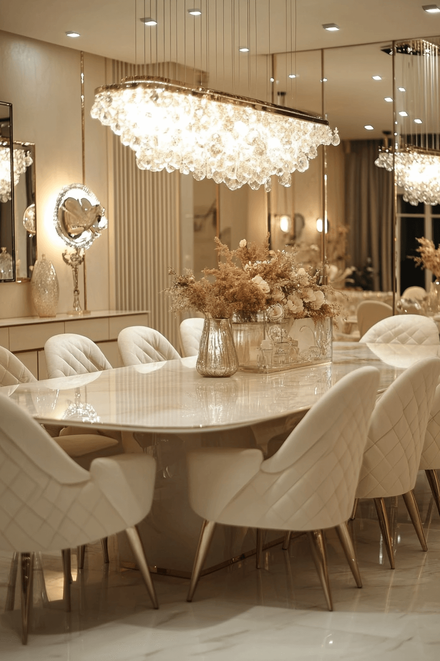 Pearl tones bring soft romance to this luxury dining room. Glossy finishes and smooth textures enhance the gentle light. The design feels serene and elevated.