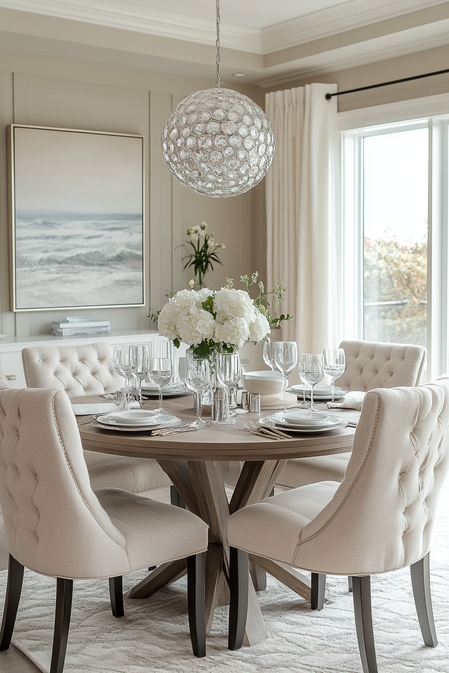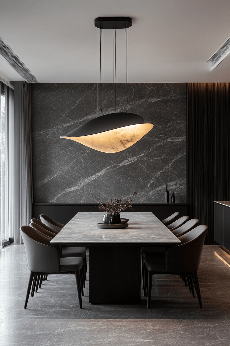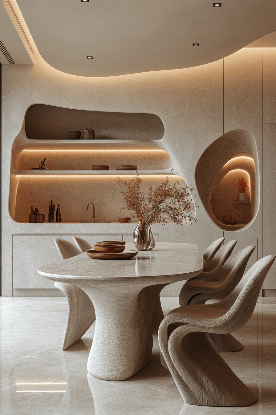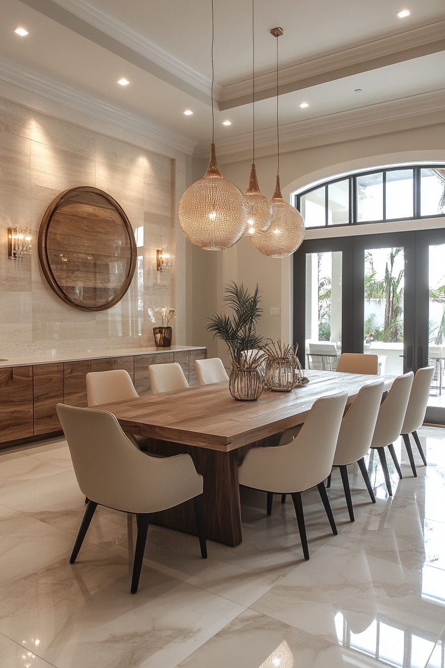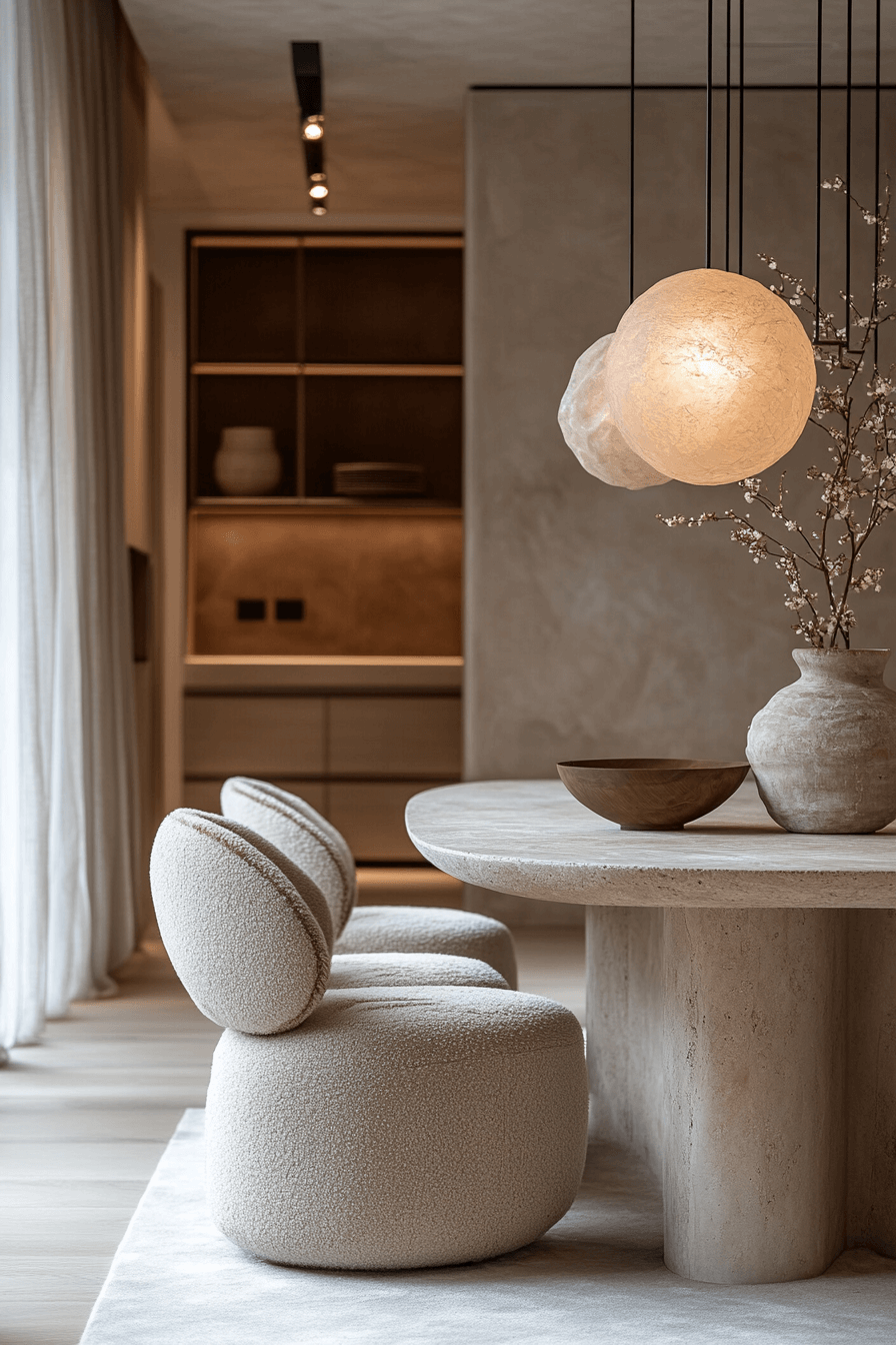 Sculptural shapes bring artistic flair to this luxury dining room. Every piece feels like a work of art, from the chairs to the lighting. The neutral palette lets the forms shine.