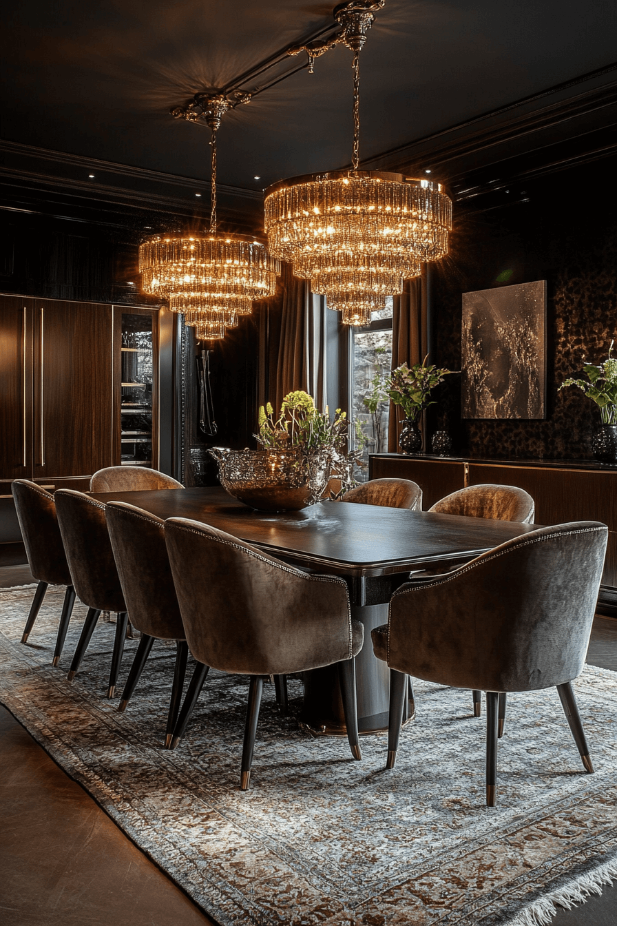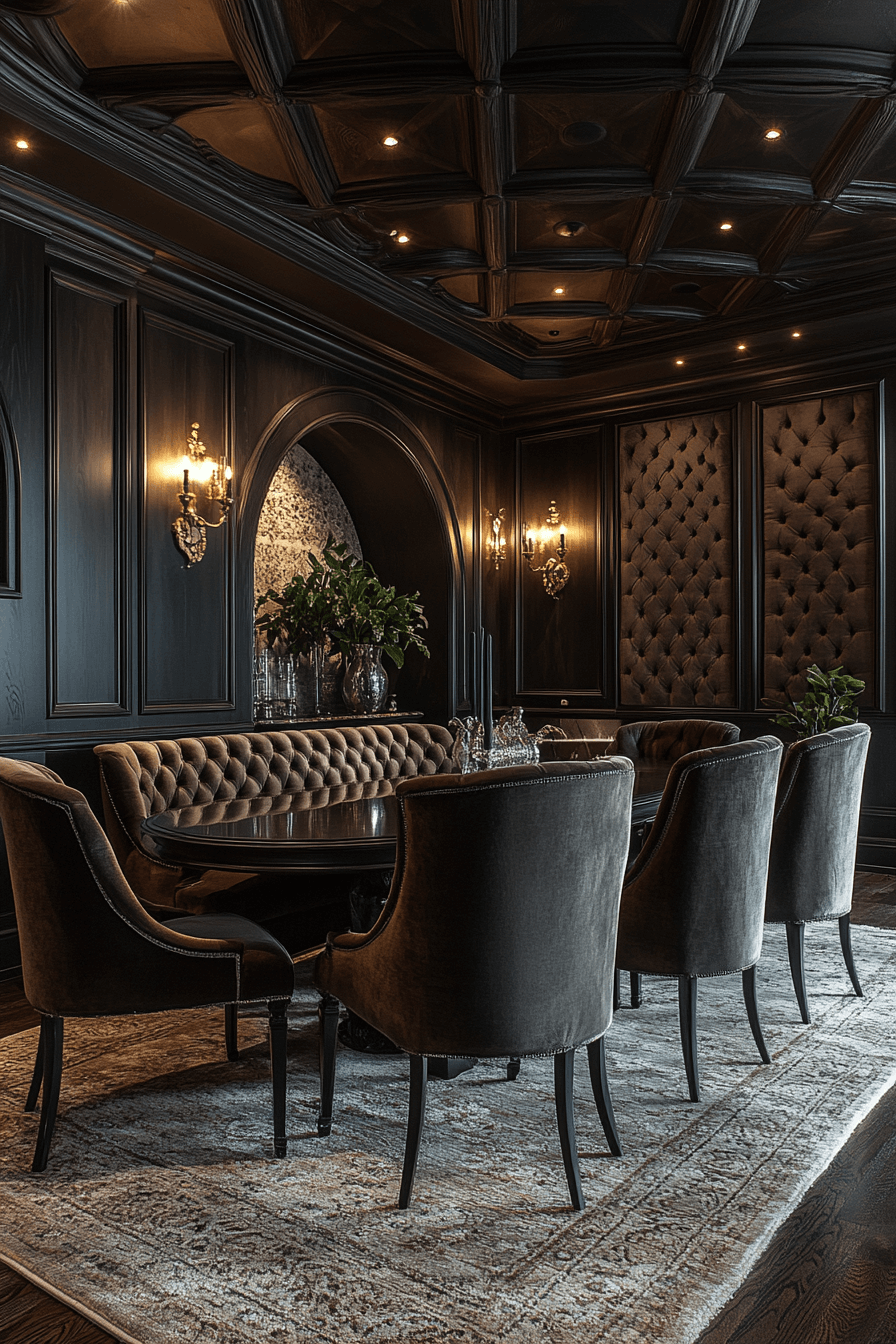 Rich, dark tones create a dramatic and intimate luxury dining room. Metallic details add just enough sparkle for a glamorous touch. Soft lighting completes the cozy, high-end vibe.