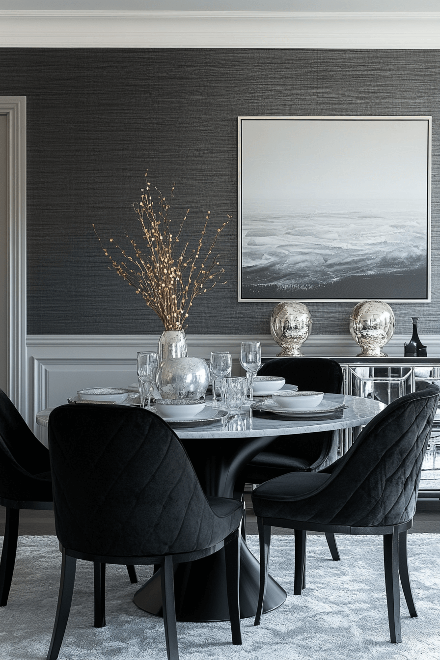 A monochrome palette brings bold contrast to this luxury dining room while maintaining balance and elegance. Black and white finishes are paired with soft textures for warmth. Minimalist art enhances the look without clutter.
