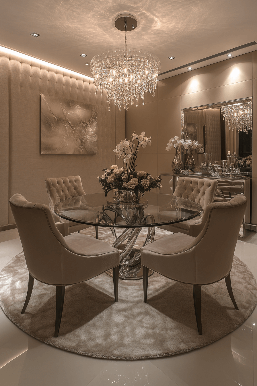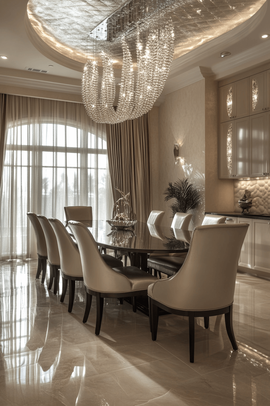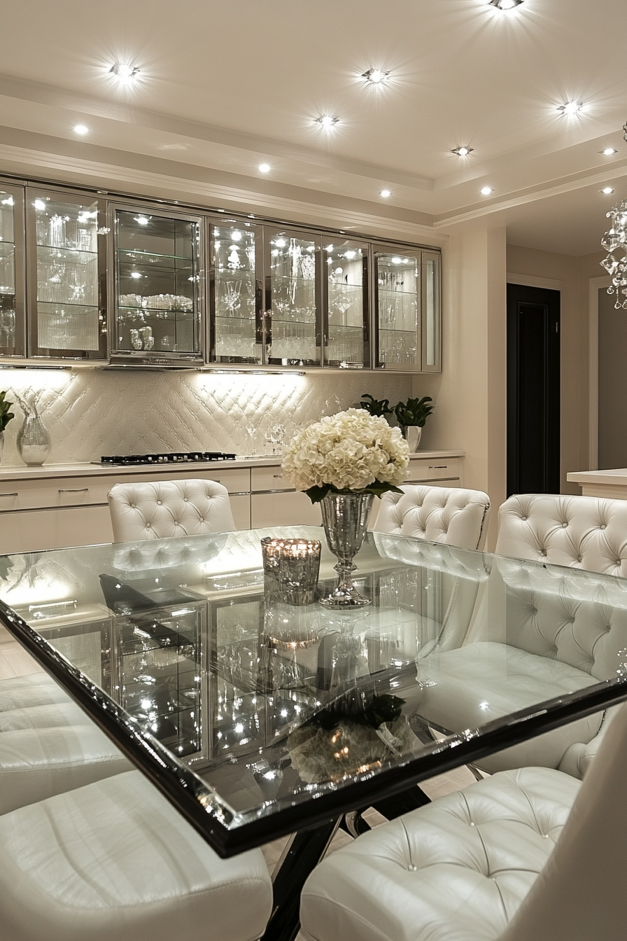 A soft sheen creates a refined glow in this luxury dining room. Gentle lighting and polished finishes add subtle brilliance. The space feels effortlessly elegant.