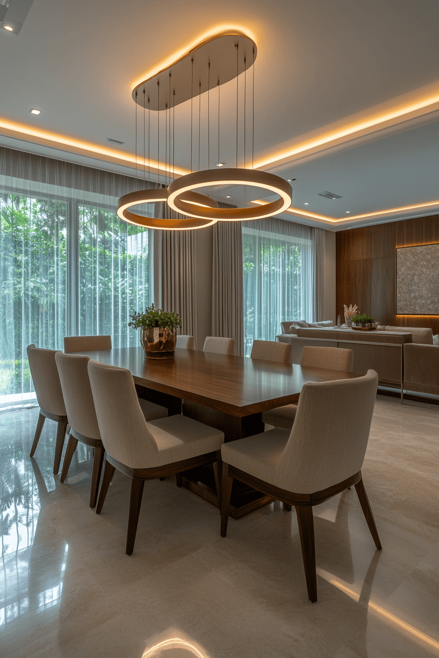 Layered lighting transforms this luxury dining room. Different light sources create a rich and inviting atmosphere. The glow highlights every detail beautifully.