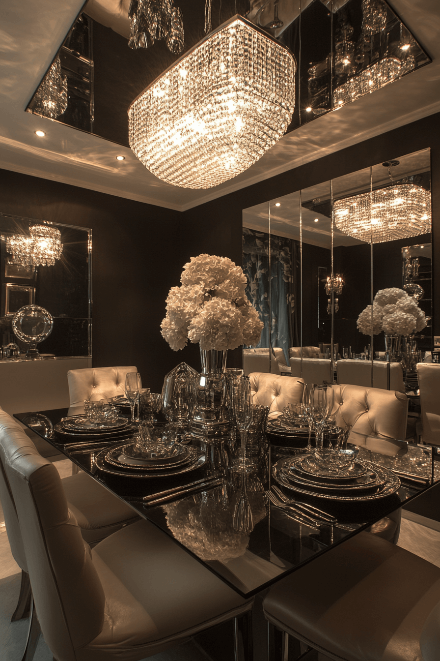 Mirrored surfaces make this luxury dining room feel open and bright. Reflections amplify the light and drama of the space. Every element shines with sophistication.