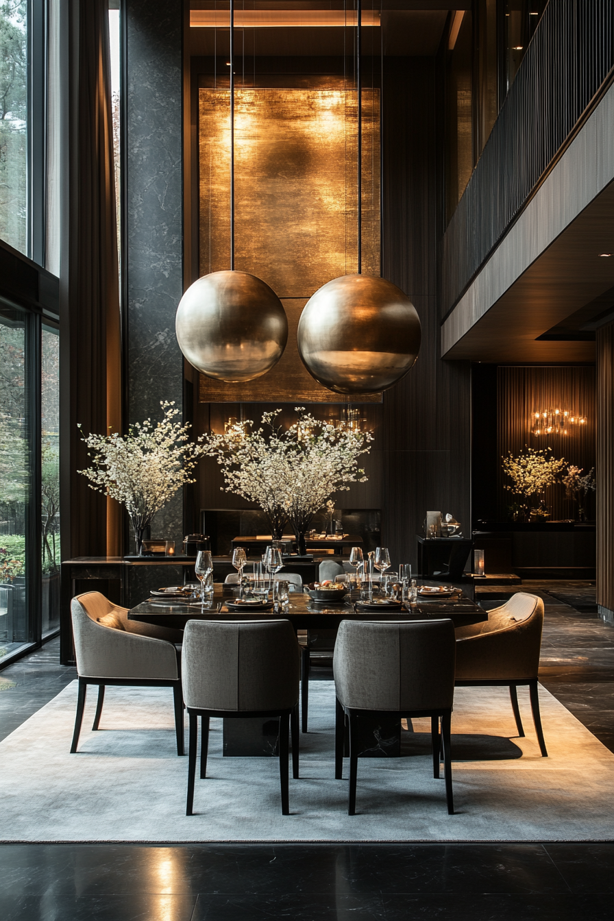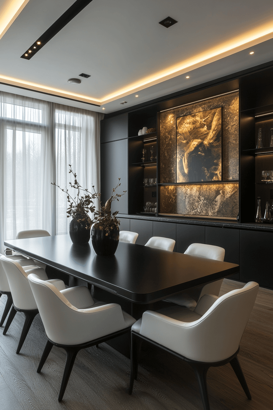 High-contrast tones bring drama to this luxury dining room. Balanced shades keep the effect refined rather than harsh. Soft textures and bold lighting tie it all together.
