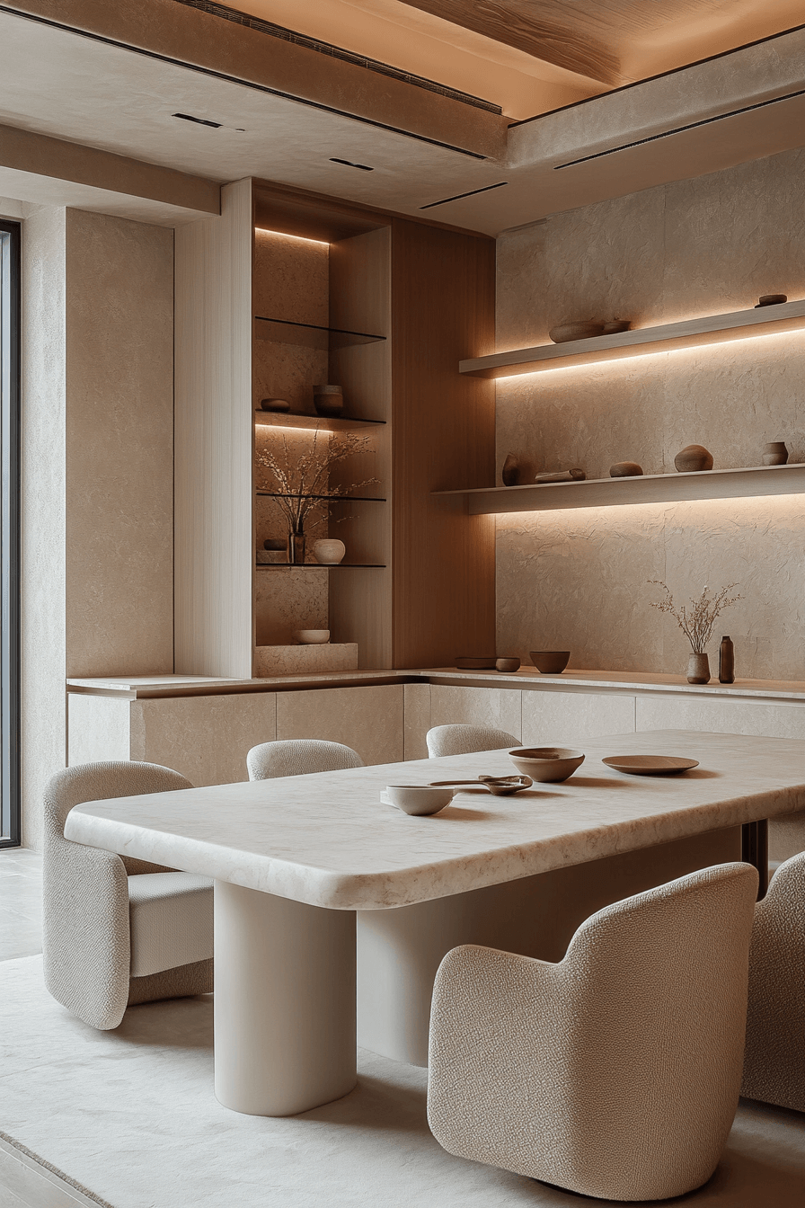 Minimal furniture and a calm color palette create a serene luxury dining room. Soft lighting and subtle accents bring warmth and comfort. The uncluttered style feels elegant and inviting.