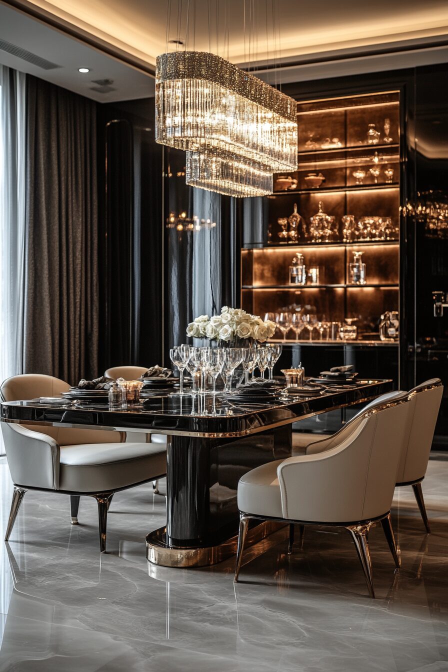 Polished finishes and chrome details give this luxury dining room a refined edge. Sleek materials are softened with plush seating for balance. Lighting enhances the glossy surfaces without overwhelming them.