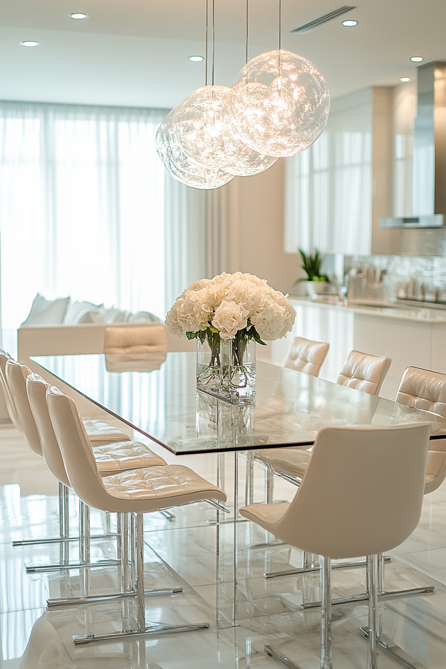 Gloss and glass combine for a luminous luxury dining room. Transparent elements keep the space light, while reflective surfaces add depth. The result is airy, modern, and glamorous.