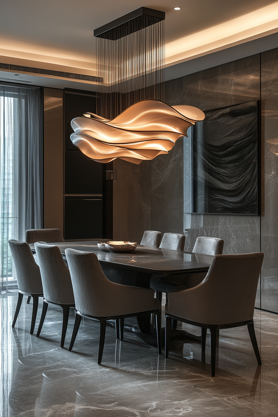 An artistic light fixture transforms your luxury dining room into a design statement. Paired with understated furniture, the dramatic piece becomes the centerpiece. Neutral tones allow it to truly stand out.