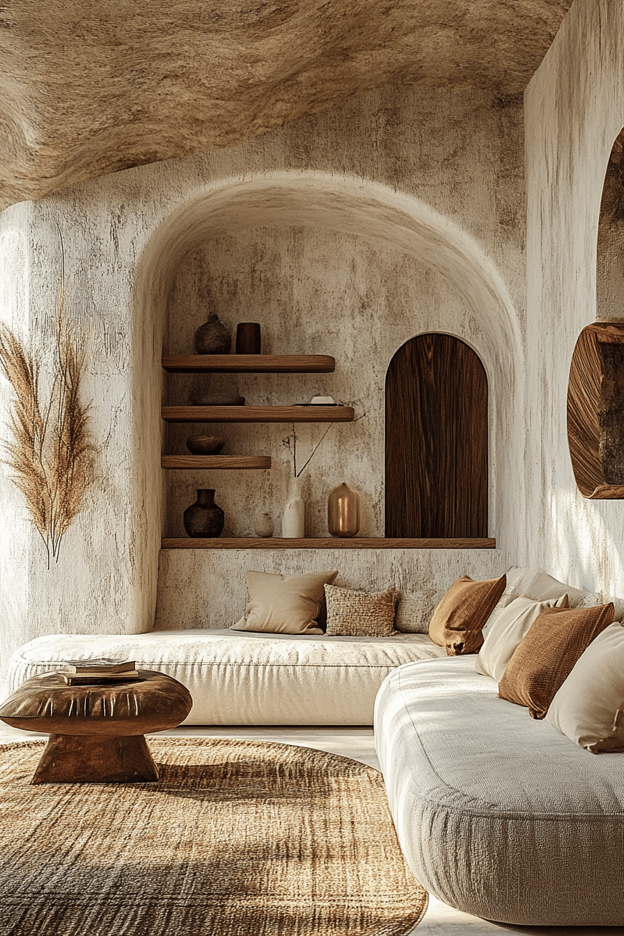 Incorporate creativity with abstract earth elements like organic wall art and sculptural vases. Keep colors warm for unity. Mix smooth and rough textures for contrast. This approach feels artistic yet livable.