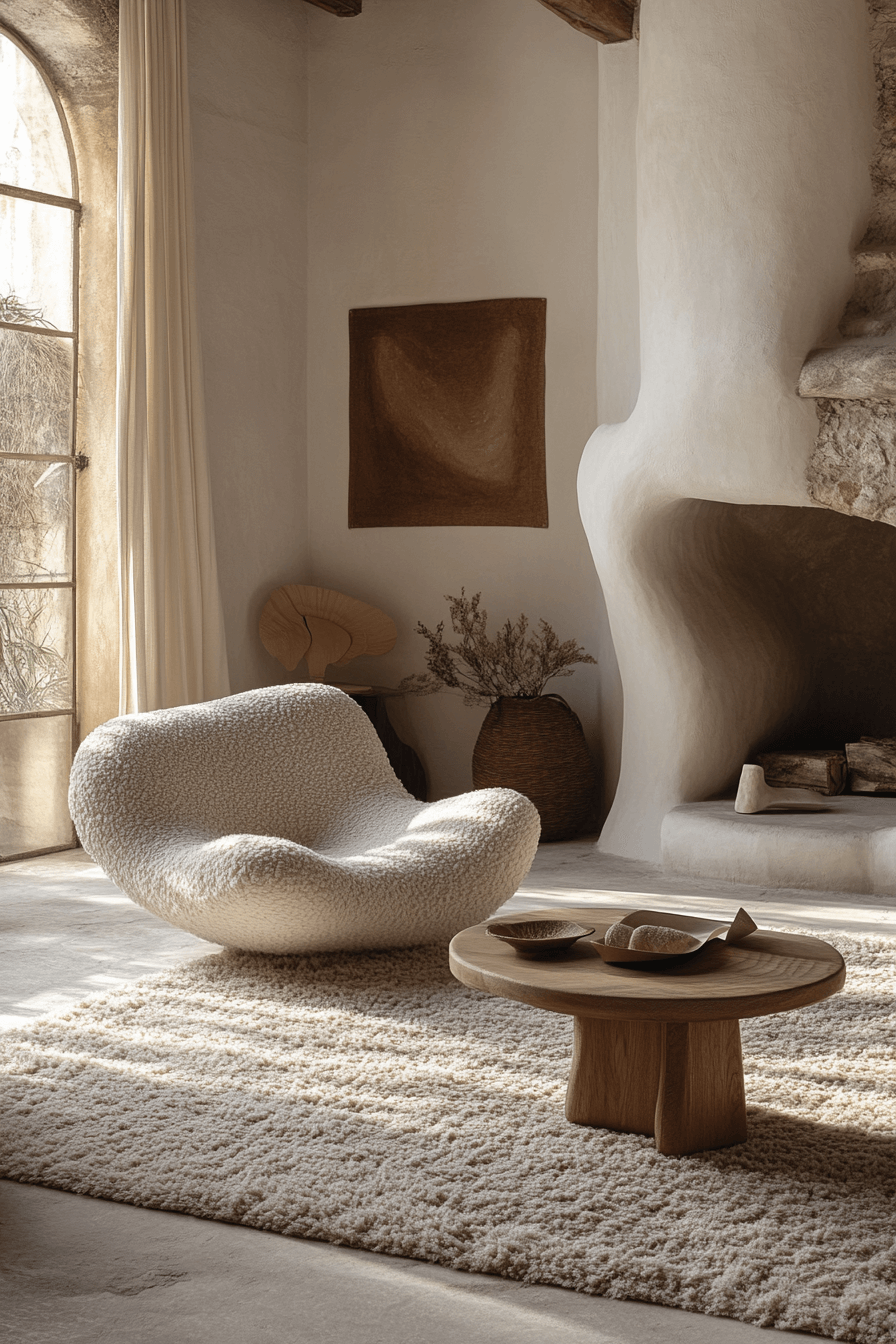 Soften your space with gentle geometric touches like round mirrors, arched bookshelves, and circular rugs. These curves create a smooth flow throughout the room. Stick to natural colors for harmony. Layer textures for dimension without clutter.